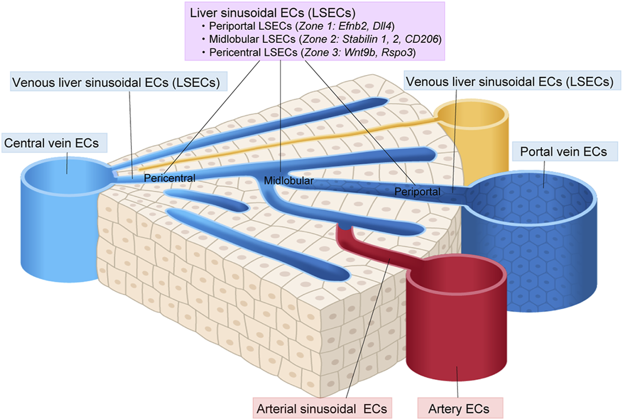 FIGURE 6. Vascular endothelial cell heterogeneity in the liver. Vascular endothelial cells (ECs) in the liver show diverse heterogeneity. Liver sinusoidal ECs (LSECs) can be classified into periportal, midlobular, and pericentral ECs.