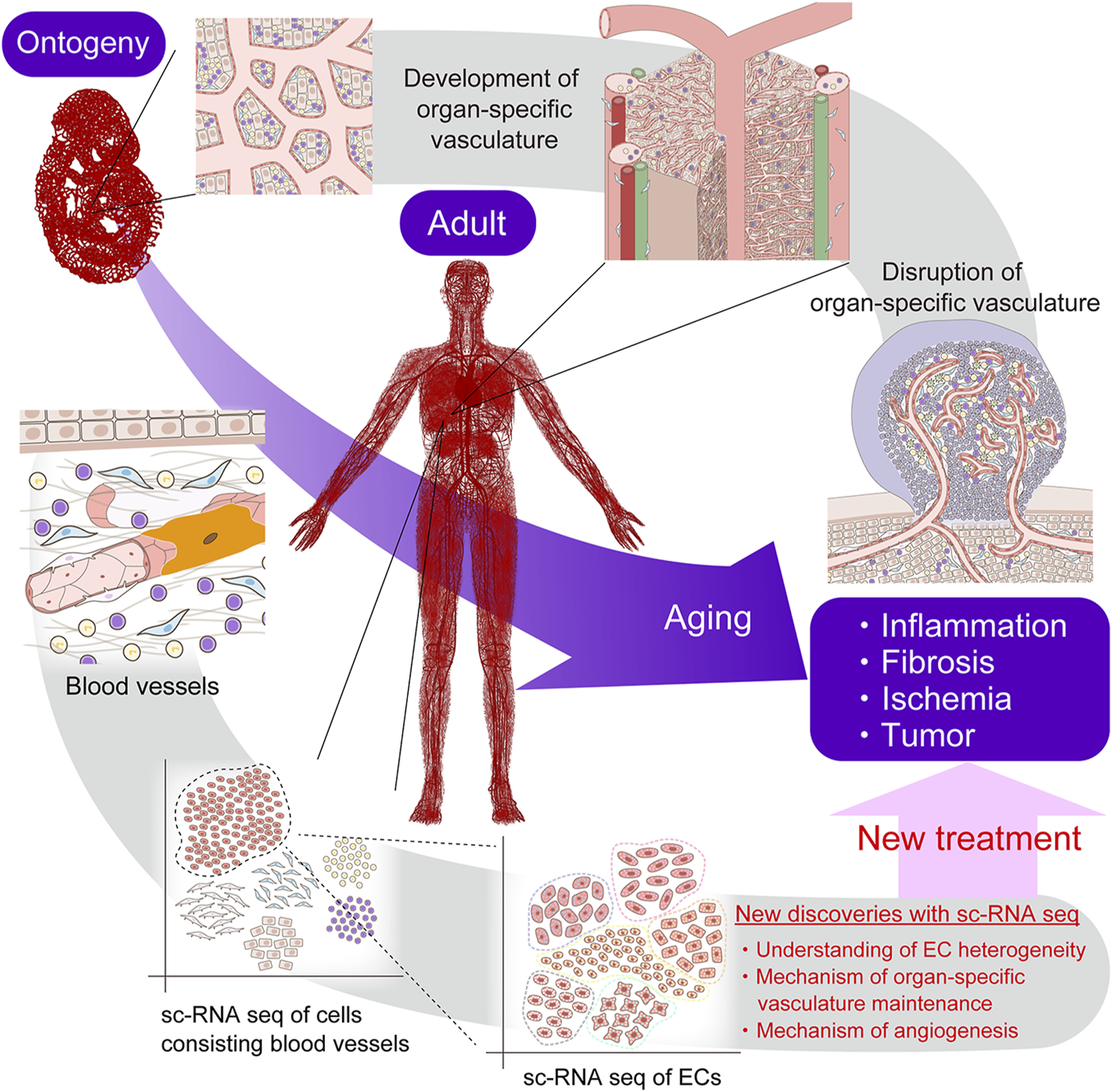 Recent advances in scRNA-seq include the identification of new and rare EC subtypes, such as aerocytes (Gillich et al., 2020), the hierarchy of ECs (Rohlenova et al., 2020), novel marker genes for EC subtypes (Kalucka et al., 2020), and vascular biology mechanisms underlying organ homeostasis and diseases (Goveia et al., 2020; Becker et al., 2022). These new findings are expected to further improve our understanding of the mechanisms of vasculature formation and homeostasis, while also contributing to the development of new therapies for blood vessel–related diseases.