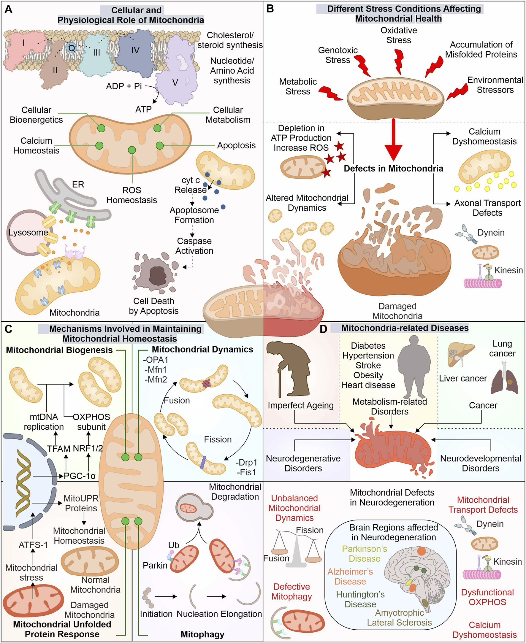 Mitochondria possess different quality control mechanisms to circumvent such situations, including chaperones and proteases. UPRmt activated upon increase in mitochondrial stress communicates with the nucleus for induced expression of mitostasis proteins. The dynamics and autophagy of mitochondria also regulate its health by either diluting the mitochondrial damage (fusion) or degrading dysfunctional mitochondria (fission and mitophagy). The pathogenic misfolded proteins from neurodegenerative diseases are known to interfere with these mitostasis pathways. The AD (Aβ, tau), ALS (SOD1), and PD (LRRK2) pathogenic proteins interact and alter fission proteins inducing aberrant mitochondrial fragmentation. These misfolded proteins can disturb mitochondrial contact with ER and lysosomes, resulting in impairment of calcium homeostasis and autophagy. The increased cytosolic calcium due to dysfunctional ER-mitochondria connection is also linked with defective mitochondrial transport. The negative impact of disease-misfolded proteins on cellular protein quality control (PQC) machinery hampers mitochondrial quality control, intensifying the damage to multiple mitochondria-dependent cellular processes. Despite the existence of many sophisticated methods for understanding the pathogenesis of disorders, no effective treatments are currently available for mitochondrial-associated diseases. Therapeutic approaches for mitochondrial diseases are presently limited to enhancing electron transfer in OXPHOS, using antioxidants, and stimulating mitochondrial biogenesis, among others. Furthermore, mitochondrial gene therapy, mitochondrial protein replacement therapy, mitochondrial transplantation, and nanoparticle drug delivery can be potential ways to advance mitochondrial disease therapeutics.