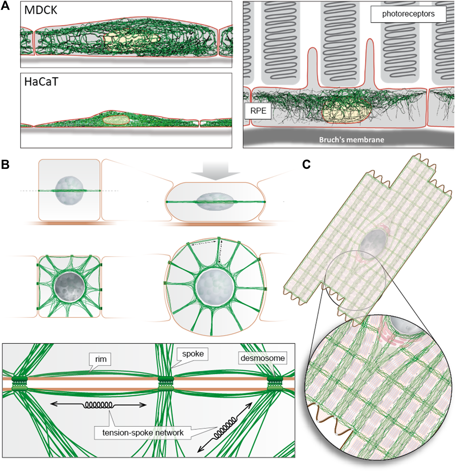 Intermediate filament architecture is cell type specific to support tissue mechanics and function. (A) The digital reconstructions of intermediate filament networks that are superimposed on schematic drawings of the corresponding cells are taken from Windoffer et al. (2022). They were derived from 3D recordings of fluorescently labelled keratins in polarized canine MDCK cells, human immortalized epidermal HaCaT keratinocytes and murine retinal pigment epithelial cells in situ. Note the different network distributions ranging from apical enrichment (RPE) to apical and basal enrichment (MDCK) and pan cytoplasmic (HaCaT). (B) The modified scheme from Quinlan et al. (2017) highlights the circumferential rim and radial spokes arrangement of keratin intermediate filaments connecting the network to the perinuclear cage and adjacent cells through desmosomes. The resulting transcellular tension-spoke system provides mechanical resilience. (C) Schematic representation of desmin intermediate filament architecture in cardiomyocytes providing defined subcellular spaces for the ordered contractile apparatus, mitochondria, the nucleus and attachment sites to neighbouring cardiomyocytes and the extracellular matrix (adapted from (Behrendt, 1977; Tokuyasu et al. 1983; Wang and Ramirez-Mitchell, 1983)).