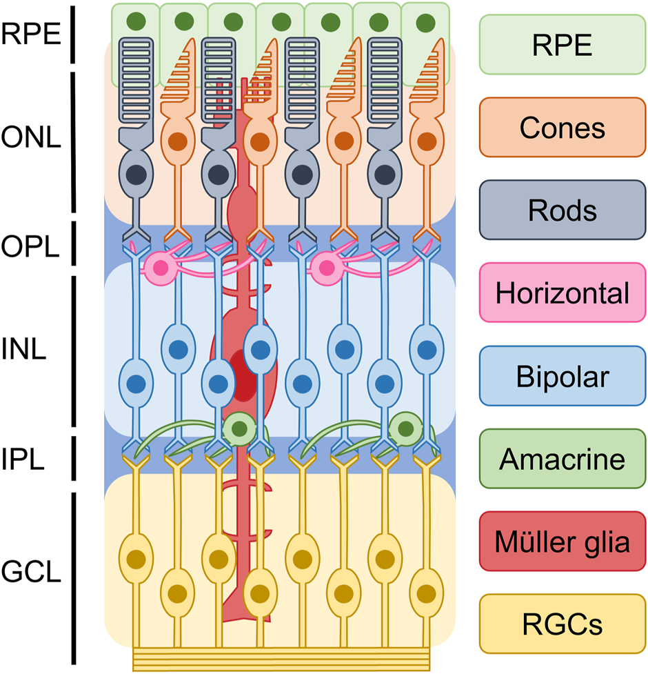 Basic structure of retina. Based on current understanding of the epigenetics of retinal cells, it is possible to classify the retina into distinct cellular types. These include photoreceptors, bipolar cells, retinal ganglion cells (RGCs), horizontal cells, amacrine cells, and glial cells. They are divided into ganglion cell layer (GCL), inner plexiform layer (IPL), inner nuclear layer (INL), outer plexiform layer (OPL), and outer nuclear layer (ONL), retinal pigment epithelium (RPE).