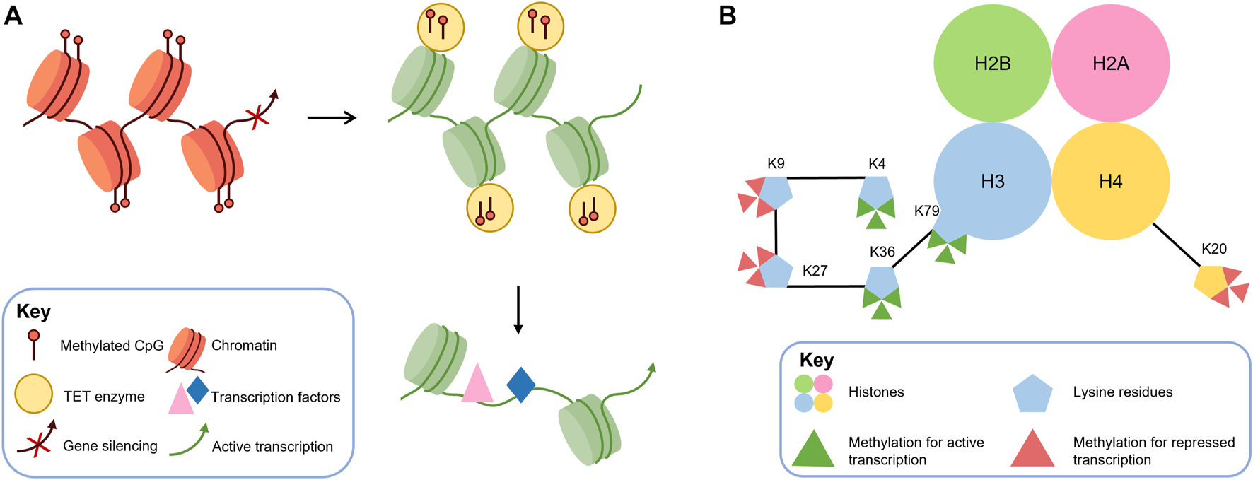 DNA methylation and histone methylation are crucial epigenetic mechanisms that can regulate gene transcription. (A) DNA methylation can alter local chromatin structure and reduce accessibility for transcription factors, resulting in decreased transcriptional activity. Conversely, demethylation mediated by TET enzymes can reverse this effect by increasing DNA accessibility and promoting transcription factor binding, leading to enhanced transcriptional activity. (B) Histone methylation predominantly occurs at specific lysine (K) residues on histones H3 and H4, resulting in mono-, di-, or trimethylation (me1, me2, and me3). H3K4, H3K36, and H3K79 methylation are generally associated with transcriptional activation. In contrast, H3K9, H3K27, and H4K20 methylation are associated with transcriptional repression.