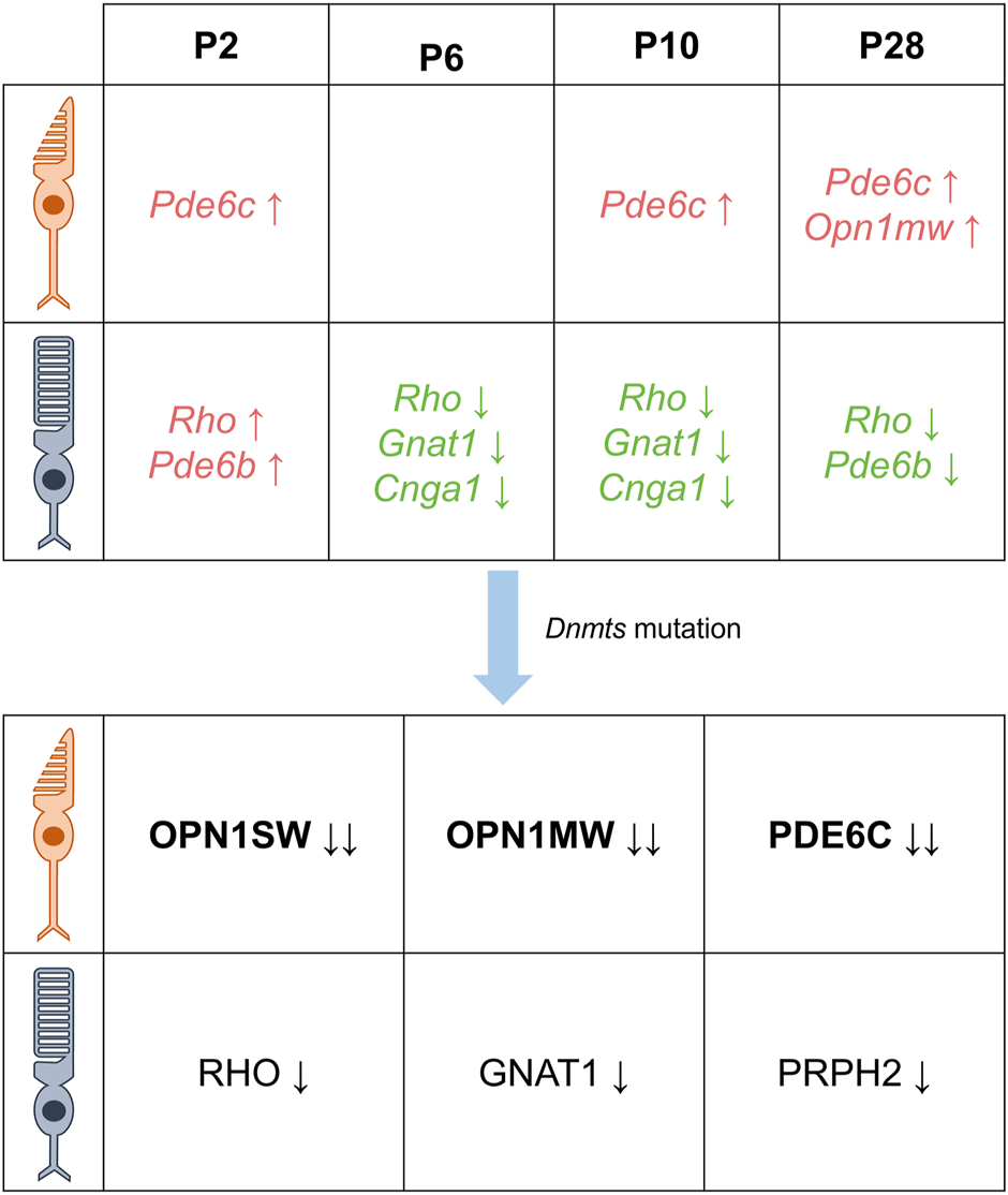 DNA methylation is characterized differently at different times in the photoreceptor. There are differential DNA methylation patterns associated with the expression of cone- and rod-specific genes in the postnatal mouse retina. Specifically, the cone-specific genes Pde6c and Opn1mw exhibit increased levels of methylation, while the rod-specific genes Rho, Gnat1, and Cnga1 show lower levels of methylation from 6 days after birth. In addition, mutations in Dnmt resulted in decreased protein levels of cone-specific proteins OPN1SW, OPN1MW, PDE6C and rod-specific proteins RHO, GNAT1, and PRPH2, with cones being more severely affected than rods (Green indicates decreased DNA methylation, red indicates increased DNA methylation, black indicates decreased protein levels, the direction of the arrow indicates an increase or decrease, and the number of arrows indicates a change in level.)