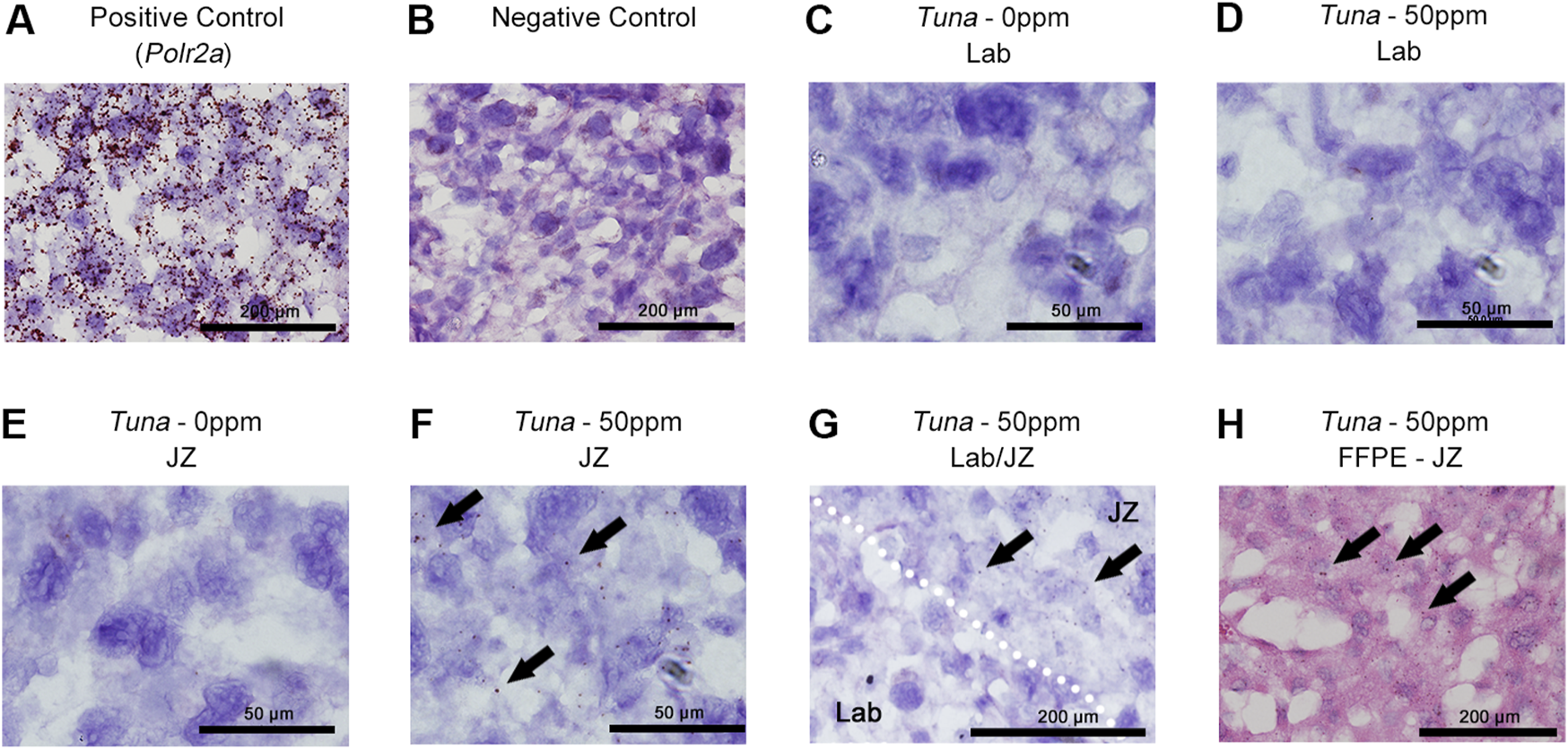 Distribution of Tuna transcripts in female e18.5 mouse placental sections. (A) Detection of positive control Polr2a in H&E counter-stained fresh frozen e18.5 placenta; brown signal represents at least a single Polr2a mRNA molecule. (B) Negative control. (C)Tuna in 0 ppm Lab. (D)Tuna in 50 ppm Lab. (E)Tuna in 0 ppm JZ. (F)Tuna in 50 ppm JZ. (G)Tuna at the intersection of Lab and JZ in 50 ppm CdCl2 sections. (H)Tuna in 50 ppm JZ formalin fixed paraffin embedded sections. Arrows indicate positive Tuna signal. In situ hybridization was performed on n = 4 per group; representative images are shown.
