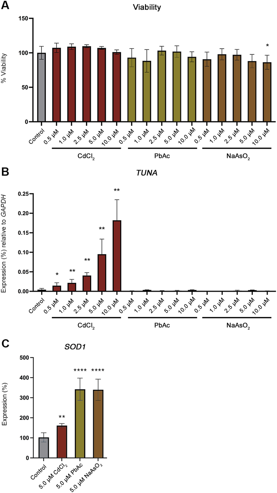 Viability and TUNA expression in Jeg-3 cells after 24 h of toxic metal exposure. (A) Viability of Jeg-3 cells exposed to 0, 0.5, 1.0, 2.5, 5.0, and 10.0 µM concentrations of CdCl2, PbAc, and NaAsO2 for 24 h, detected by CytoTox-Glo. (B)TUNA transcript abundance in Jeg-3 cells in response to 0, 0.5, 1.0, 2.5, 5.0, and 10.0 µM concentrations of CdCl2, PbAc, and NaAsO2 analyzed by qRT-PCR. (C)SOD1 transcript abundance in unexposed control cells and in 5 μM CdCl2, 5 μM PbAc, 5 μM NaAsO2 exposed Jeg-3 cells at 24 h. Data are presented as mean of mean ± SE from three technical replicates within each of three independent experiments. Analyzed by one-way ANOVA with Tukey’s post-hoc test on values determined through MAD analysis. *p < 0.05, **p < 0.01, ****p < 0.0001.