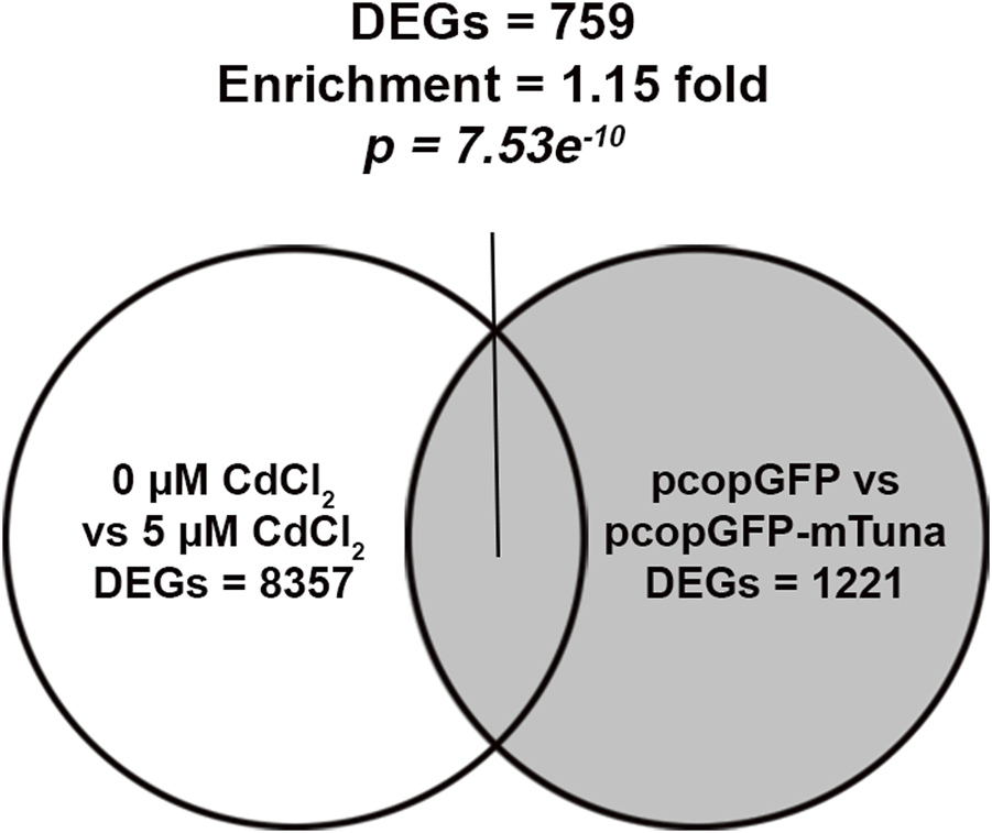 For gene set enrichment analysis, the common DEGs between the 0 vs. 5 µM CdCl2 exposed Jeg-3 cells and pcopGFP vs. pcopGFP-mTuna transfected cells detected through RNA-seq were analyzed via hypergeometric calculation as described previously (Baptissart et al., 2022).