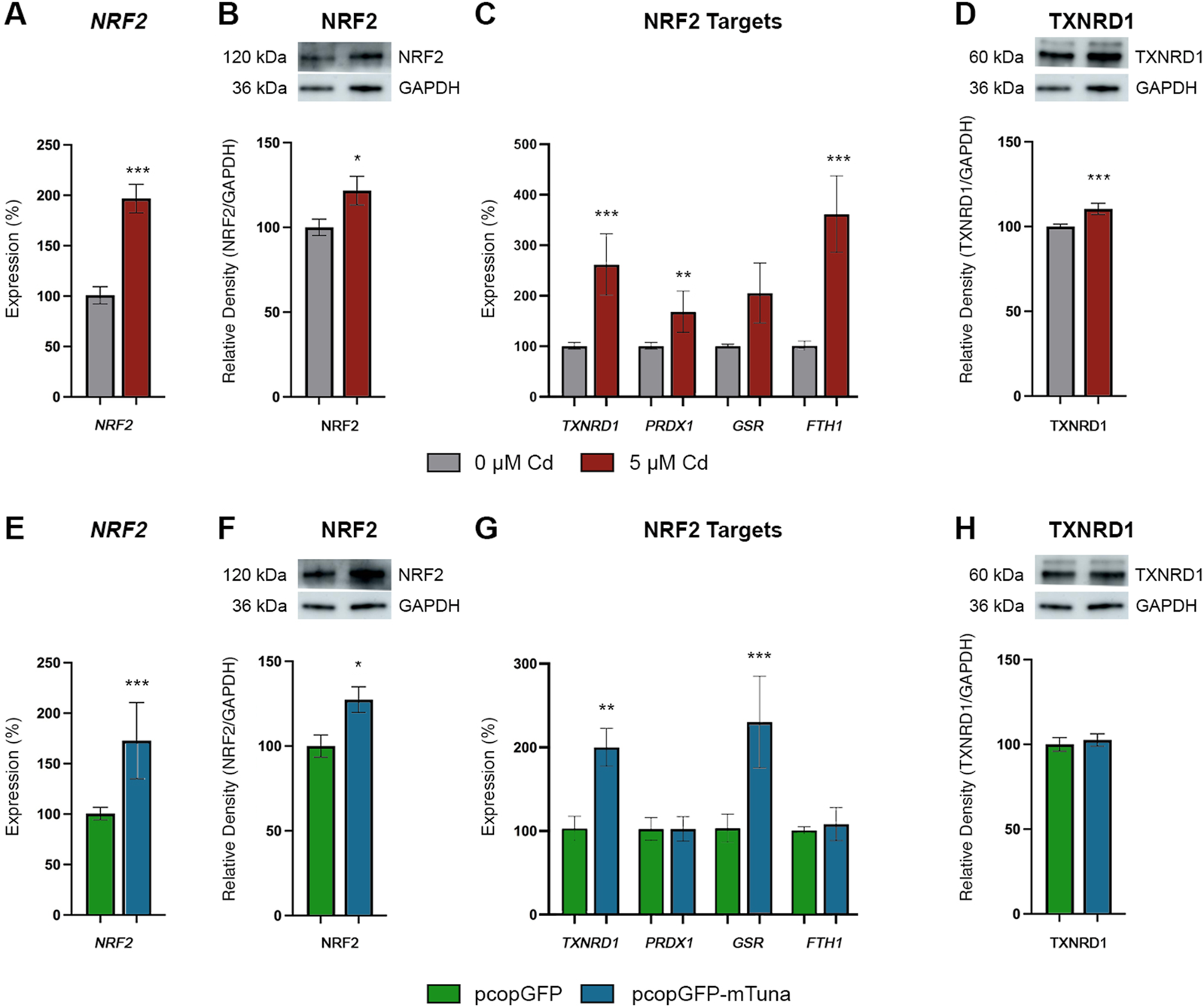 NRF2 Oxidative Stress Response Pathway transcript and protein abundance in Jeg-3 cells in response to CdCl2 exposure and Tuna overexpression. (A)NRF2 transcript abundance in Jeg-3 cells in response to 0 and 5 μM CdCl2 at 24 h. (B) NRF2 protein abundance in response to 0 and 5 µM CdCl2 at 24 h. (C)TXNRD1, PRDX1, GSR, and FTH1 transcript abundance in response to 0 and 5 µM CdCl2 at 24 h. (D) TXNRD1 protein abundance in response to 0 and 5 µM CdCl2 at 24 h. (E)NRF2 transcript abundance in Jeg-3 cells in response to pcopGFP and pcopGFP-mTuna at 24 h. (F) NRF2 protein abundance in response to pcopGFP and pcopGFP-mTuna at 24 h. (G)TXNRD1, PRDX1, GSR, and FTH1 transcript abundance in response to pcopGFP and pcopGFP-mTuna at 24 h. (H) TXNRD1 protein abundance in response to pcopGFP and pcopGFP-mTuna at 24 h. Analyzed by Student’s t-test, two-tailed, on values determined through MAD analysis from three independent experiments, each with three technical replicates. *p < 0.05, ***p < 0.001. Representative westerns blots are shown in panels (B), (D), (F), and (H). Membranes were cut and probed independently for NRF2, TXNRD1, and GAPDH therefore GAPDH images are duplicated between (B) and (D), and between (F) and (H).