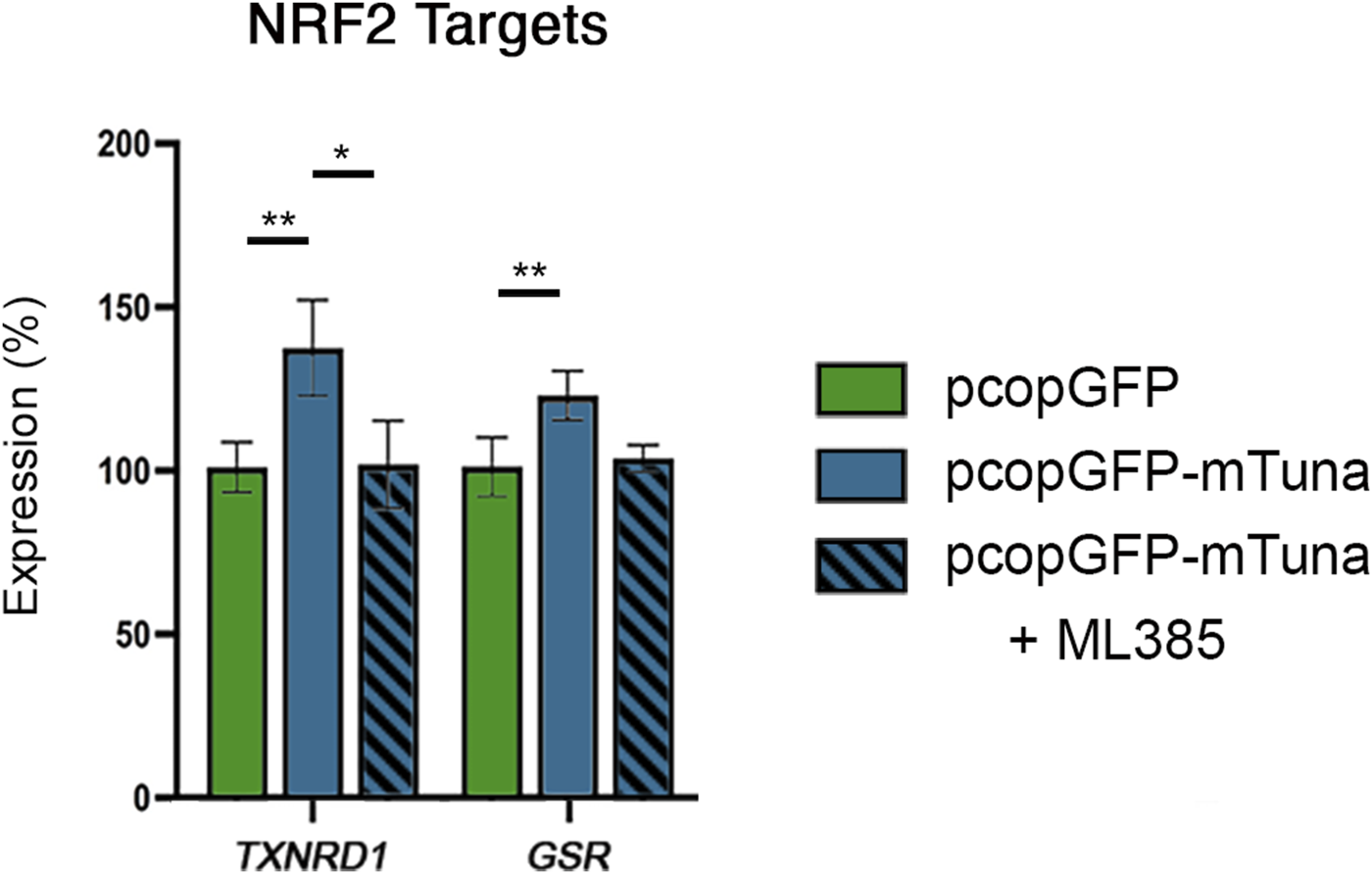The capability of lncRNAs to interact with DNA, RNA, and proteins allows them to regulate gene transcription and signaling pathways through a variety of mechanisms (Statello et al., 2021). While it is possible that Tuna-induced activation of selected NRF2 target genes occurs through direct binding of Tuna transcripts to the promoters of these genes, our observation that Tuna upregulates NRF2/NRF2 transcript and protein levels suggests that Tuna might drive the expression of these targets through the NRF2 pathway. To test this hypothesis, we compared NRF2 target transcript abundance between cells transfected with pcopGFP, pcopGFP-mTuna, and pcopGFP-mTuna in the presence of the NRF2 inhibitor ML385. As before, the expression of TXNRD1 and GSR was significantly increased in cells overexpressing Tuna compared to GFP overexpressing controls, but this did not occur in the presence of ML385 (Figure 7). These data show that Tuna is acting through NRF2 to drive the NRF2-mediated oxidative stress response.