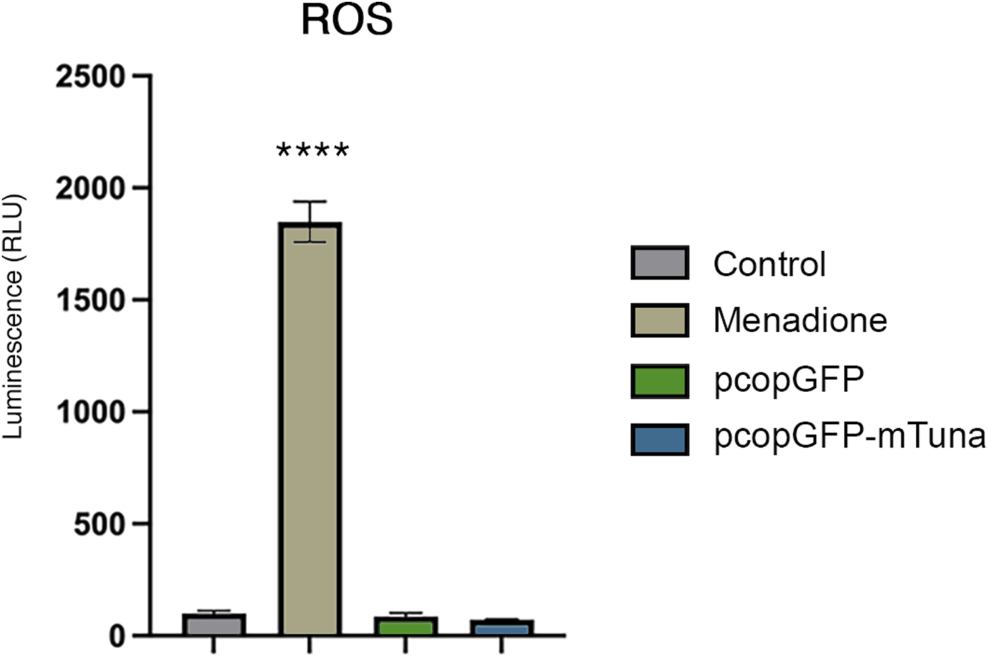 ROS levels in vehicle (control) and menadione exposed Jeg-3 cells compared to GFP control and Tuna overexpressing cells at 24 h post transfection. Data are presented as mean of means ± SE from three technical replicates within each of three independent experiments. Analyzed by one-way ANOVA with Tukey’s post-hoc test on values determined through MAD analysis. ****p < 0.0001.