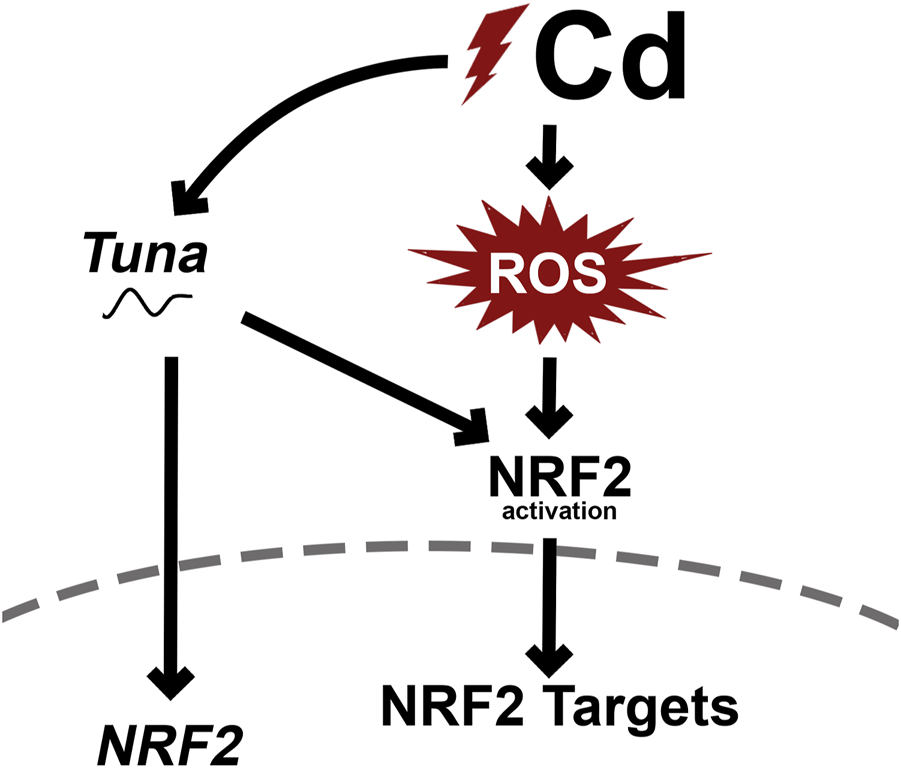 Studies in rat cells have shown that CdCl2 activates Nrf2, protecting against Cd-induced apoptosis (Chen and Shaikh, 2009). However, our viability and proliferation assays of Tuna overexpression did not show any changes in viability and actually showed decreased proliferation. This may indicate that there is a protective function of Tuna that is acting outside of NRF2. LncRNAs have been shown to act as scaffolding for protein complexes capable of targeting enhancer and promoter regions of the genome. Utilizing an RNA/chromatin interaction assay such as chromatin isolation by RNA purification (ChIRP) would help to identify potential genomic locations to which Tuna binds and may reveal potential novel roles of Tuna in controlling the cellular response to Cd.