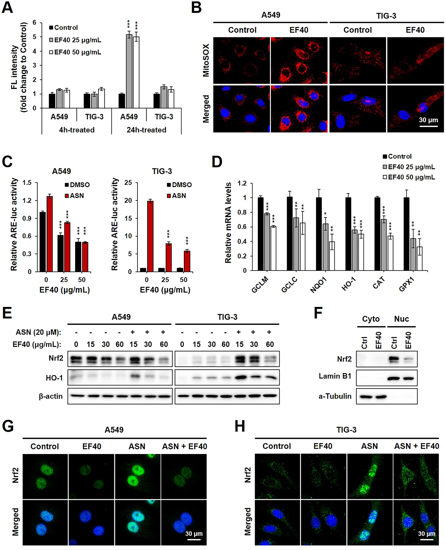 EF40 disrupts ROS homeostasis by suppression of NRF2-ARE signaling (A) Cellular ROS level measured by H2DCFDA assay showing that 24 h exposure to EF40 increases ROS in A549 but not in TIG-3 cells. Data are represented as mean ± SD (n = 3), ***p ≤ 0.001 (Student’s t-test to Control). (B) Mitochondrial ROS level measured by MitoSOX staining showing elevated ROS production in EF40-treated (25 μg/mL, 24 h) A549 but not in TIG-3 cells. (C) ARE luciferase activity of control and EF40-treated cells in the presence or absence of sodium arsenite (ASN, 20 μM) for 16 h. Data are represented as mean ± SD (n = 3), ***p ≤ 0.001 (Student’s t-test to 0 μg/mL). (D) qPCR analysis showing that 24 h treatment of EF40 reduced the expression levels of ARE target genes in A549 cells. Data are represented as mean ± SD (n = 3), *p ≤ 0.05, **p ≤ 0.01, ***p ≤ 0.001 (Student’s t-test to Control). (E) Western blotting analyses showing decreased expressions of Nrf2 and HO-1 in EF40-treated A549 cells. ASN-induced Nrf2 and HO-1 in TIG-3 cells were also downregulated by EF40 treatment. Cells were treated with EF40 in combination with/without ASN (20 μM) for 6 h. (F) Western blotting analysis showing decreased nuclear level of Nrf2 in EF40-treated (25 μg/mL, 24 h) A549 cells. Lamin B1 and α-Tubulin were used as loading controls for nuclear and cytoplasm protein fractions, respectively. (G) Immunostaining of Nrf2 showing decreased expression in nuclei in EF40-treated (25 μg/mL) A549 cells with/without ASN induction (20 μM) for 6 h (H) TIG-3 cells showing cytoplasmic distribution of Nrf2 at low level; its induction by ASN (20 μM) was suppressed when co-incubated with EF40 (25 μg/mL) for 6 h.