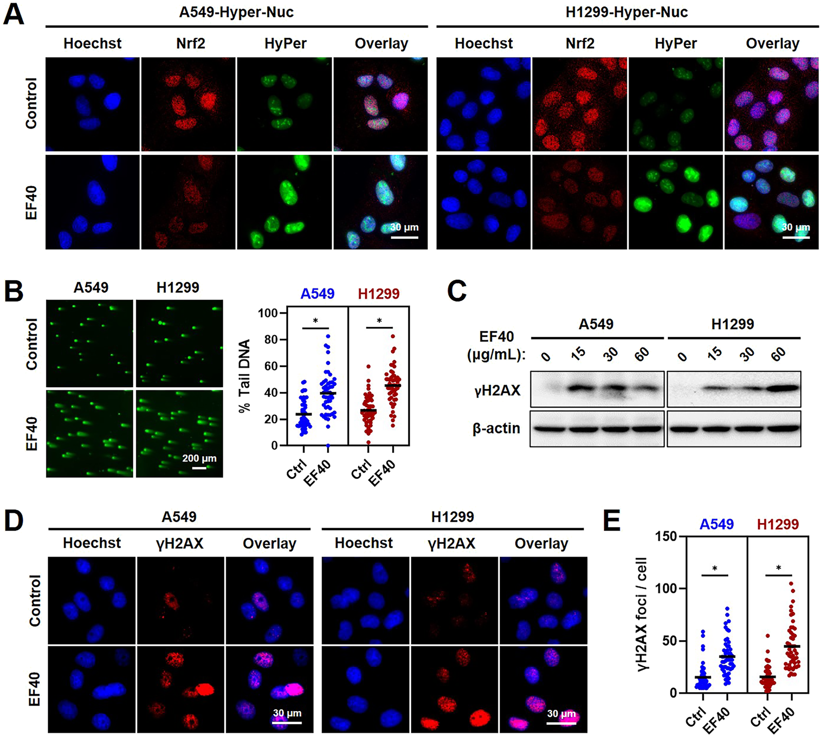 ROS accumulation resulted from EF40 treatment induces DNA damage in NSCLC cells (A) Fluorescence microscopy imaging of control and EF40-treated (25 μg/mL, 24 h) cells expressing HyPer-Nuc showing hydrogen peroxide induction in the nucleus along with decreased expression of Nrf2 in EF40-treated cells. (B) Comet assay in control and EF40-treated (25 μg/mL, 24 h) cells showing increase in DNA damage in EF40-treated cells. Quantitation from three independent experiments is shown on the right. *p ≤ 0.05 (Student’s t-test). A549 and H1299 cells treated with EF40 for 24 h were analyzed by (C) Western blotting and (D) immunostaining (EF40, 25 μg/mL) for the expression level of γH2AX with respect to the untreated control cells. An increase in γH2AX was observed in both methods. (E) γH2AX foci were quantified as foci per cell. Total of ∼100 cells were examined in each analysis. Black bars represent the mean values, *p ≤ 0.05 (Student’s t-test).