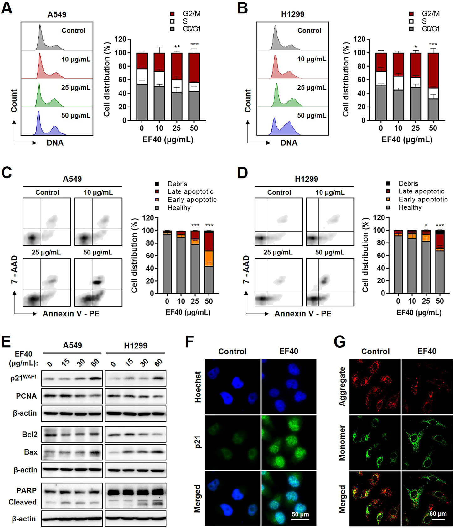 EF40-treated NSCLC cells undergo cell cycle arrest and apoptosis Cell cycle progression analyses for (A) A549 and (B) H1299 cells showing increase in cell population at G2/M arrest owing to EF40 treatment for 24 h. The quantified data are represented as mean ± SD (n = 3); significant differences in cell number of G2/M phase were identified, ***p ≤ 0.001 (Two-way ANOVA test to 0 μg/mL). (C, D) Flow cytometric analysis showing a greater increase in apoptotic cell numbers with 24 h treatment of EF40 (50 μg/mL). The quantified data are represented as mean ± SD (n = 3); significant differences in cell number of apoptotic cells (early and late) were identified, ***p ≤ 0.001 (Two-way ANOVA test to 0 μg/mL). (E) Western blotting for molecular markers of cell growth arrest and apoptosis. Treatment with EF40 for 24 h showing a dose-dependent increase in p21WAF1, Bax, and cleaved PARP. A decline in PCNA and Bcl2 was observed in EF40-treated cells. (F) Immunostaining of p21WAF1 showing increased expression level in EF40-treated (25 μg/mL, 24 h) A549 cells. (G) Analysis of mitochondrial membrane potential of A549 cells showing the depolarization after EF40 treatment (50 μg/mL, 24 h), as evident by the lack of red JC-1 aggregate accumulation.