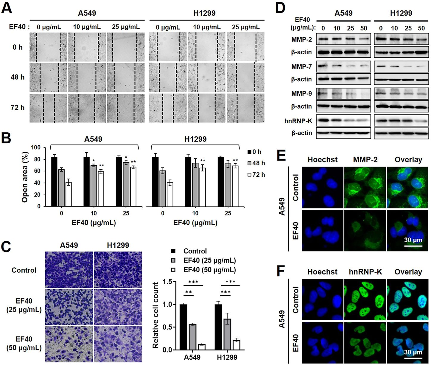 EF40 inhibits migration and invasion in NSCLC cells (A) Wound healing assay showing reduced cell migration in EF40-treated cells (magnification, ×200). (B) Quantitation of open area of the wound is shown (mean ± SD; n = 3). *p ≤ 0.05, **p ≤ 0.01 (one-way ANOVA test to 0 μg/mL). (C) Invasion assays and its quantitation showing strong inhibition with 6 h treatment of EF40 (magnification, ×100). Quantitative data are represented as mean ± SD (n = 3). **p ≤ 0.01, ***p ≤ 0.001 (one-way ANOVA test). (D) Western blotting and (E, F) immunostaining analyses of MMPs and hnRNP-K proteins showing decreased expression levels after EF40 treatment. A549 cells were treated with 25 μg/mL of EF40 for 24 h in (E, F).