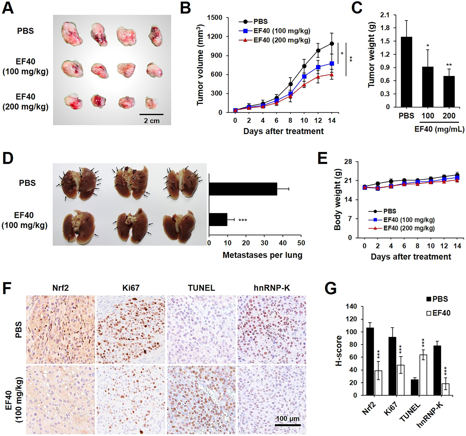 EF40 suppresses tumor growth and metastasis in NSCLC xenografts (A) Gross image of subcutaneous xenografts derived from A549 cancer cells with intraperitoneal injection of PBS and EF40. (B) Tumor volumes in different groups of mice during the course of treatment (mean ± SD; n = 4), *p ≤ 0.05, **p ≤ 0.01 (two-way ANOVA test). Subcutaneous xenografts in nude mice treated with EF40 showed retarded tumor growth rate. (C) Weight of xenograft tumors at the end of the treatments (mean ± SD; n = 4), *p ≤ 0.05, **p ≤ 0.01 (Student's t-test to PBS). (D) Image of lung metastases showing the suppression of lung tumors in EF40-treated (oral administration) mice as compared with PBS control. Quantitative result of metastases per lung is shown on the right (mean ± SD; n = 3), ***p ≤ 0.001 (Student's t-test to PBS). (E) Average body weight of mice showing no significant loss during treatments. (F) Immunohistochemical analysis showing downregulations of Nrf2, Ki-67, and hnRNP-K and upregulation of TUNEL in tumor tissues harvested from mice treated with EF40. (G) Their quantitative H-scores are shown on the right (mean ± SD; n = 4), ***p ≤ 0.001 (Student's t-test to PBS).