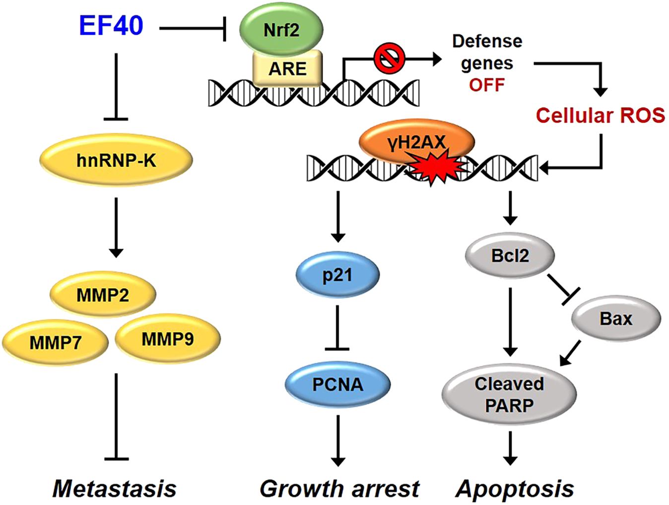 Schematic model showing the molecular mechanisms of anticancer effects of EF40. EF40 downregulates hnRNP-K, resulting in MMP-mediated repression of metastasis. The aberrantly activated Nrf2 in NSCLC cells is targeted by EF40, leading to transcriptional inhibition of ARE-dependent genes, thereby elevating intracellular ROS level. Such ROS induction, in turn, triggers DNA damage-induced growth arrest and apoptosis.