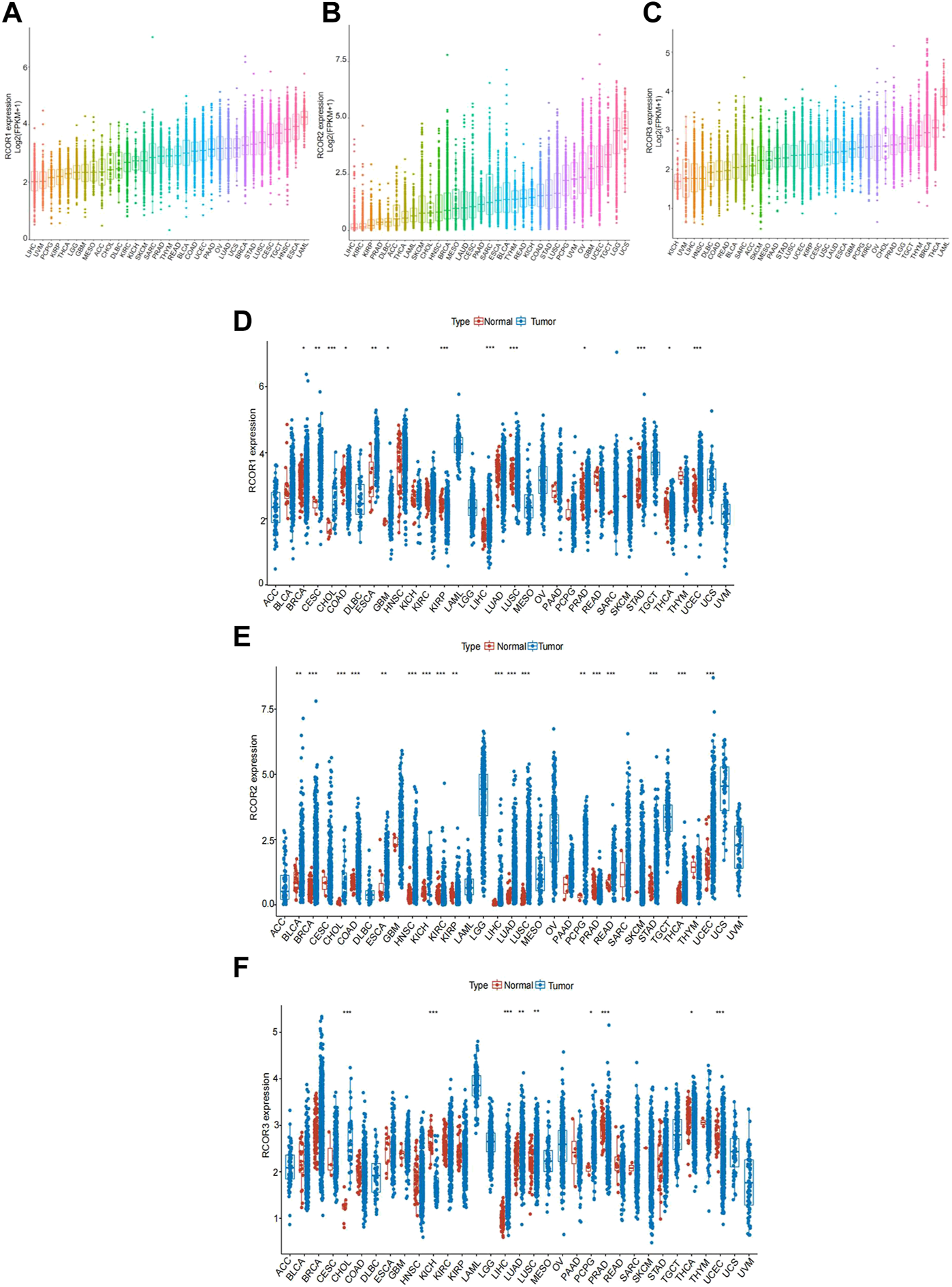 Pan-caner expression lanscape of RCORs. (A)RCOR1, (B)RCOR2 and (C)RCOR3 expression levels among different cancer tissues. (D)RCOR1, (E)RCOR2 and (F)RCOR3 expression in different cancer tissues (blue) and adjacent non-tumor tissues (red). *p < 0.05, **p < 0.01, and ***p < 0.001.