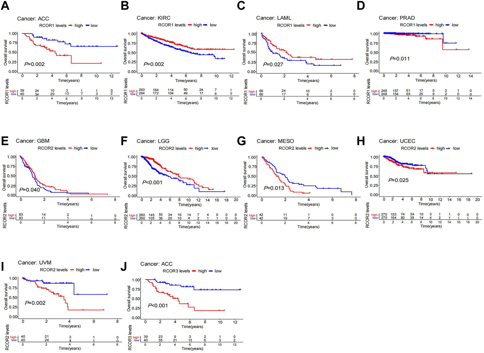 Kaplan-Meier survival analysis of RCORs in different cancers. RCOR1 as a potential prognosis factor in ACC (A), KIRC (B), LAML (C) and PRAD (D); RCOR2 as a potential prognosis factor in LGG (E), MESO (F), UCEC (G), GBM (H) and UVM (I); RCOR3 as a potential prognosis factor in ACC (J).