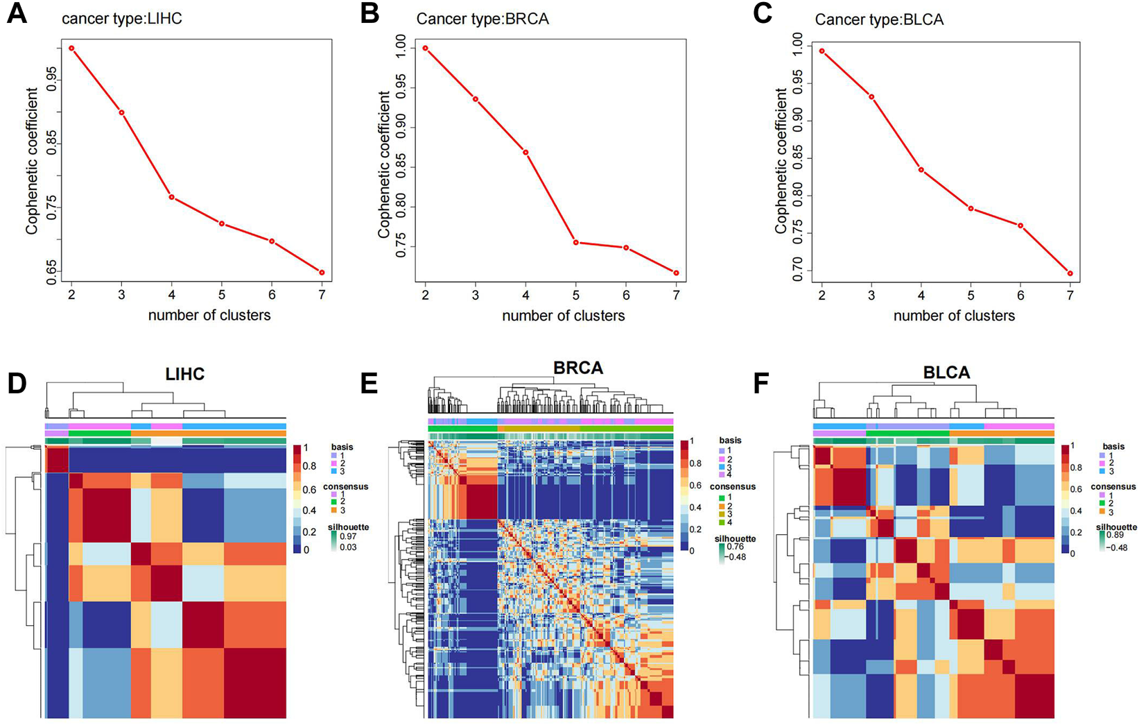 Molecular subtype analysis in various cancers. Cophenetic coefficient in RCORs in HCC (A), BRCA (B) and BLCA (C); heatmaps of molecular subtypes of RCORs in HCC (D), BRCA (E) and BLCA (F).