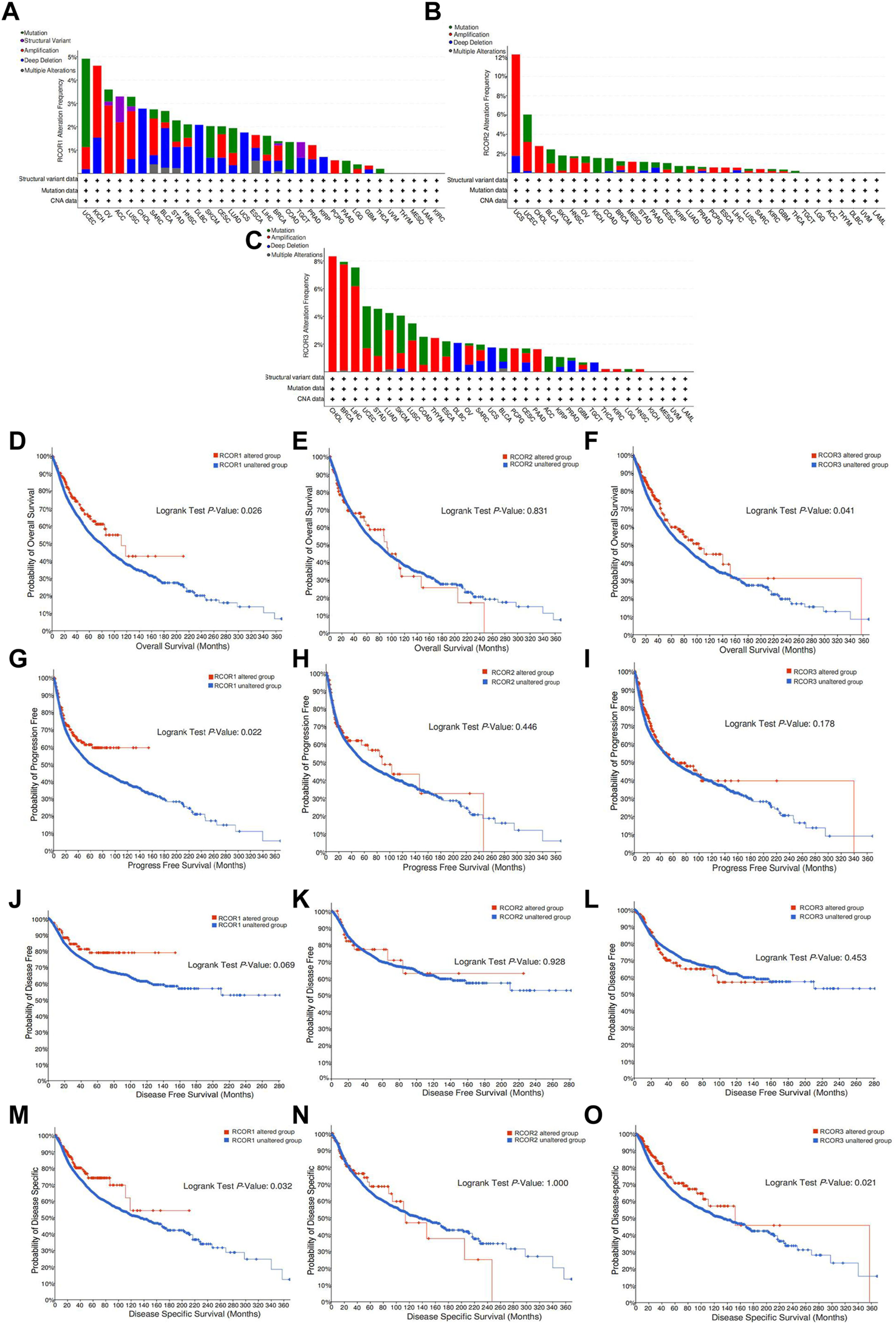 Genetic alteration of RCORs in pan-cancer. The alteration frequency of RCOR1(A), RCOR2(B) and RCOR3(C) in different cancers. Effect of RCOR1(D), RCOR2(E) and RCOR3(F) alteration status on OS. Effect of RCOR1(G), RCOR2(H) and RCOR3(I) alteration status on PFS. Effect of RCOR1(J), RCOR2(K) and RCOR3(L) alteration status on DFS. Effect of RCOR1(M), RCOR2(N) and RCOR3(O) alteration status on DSS.