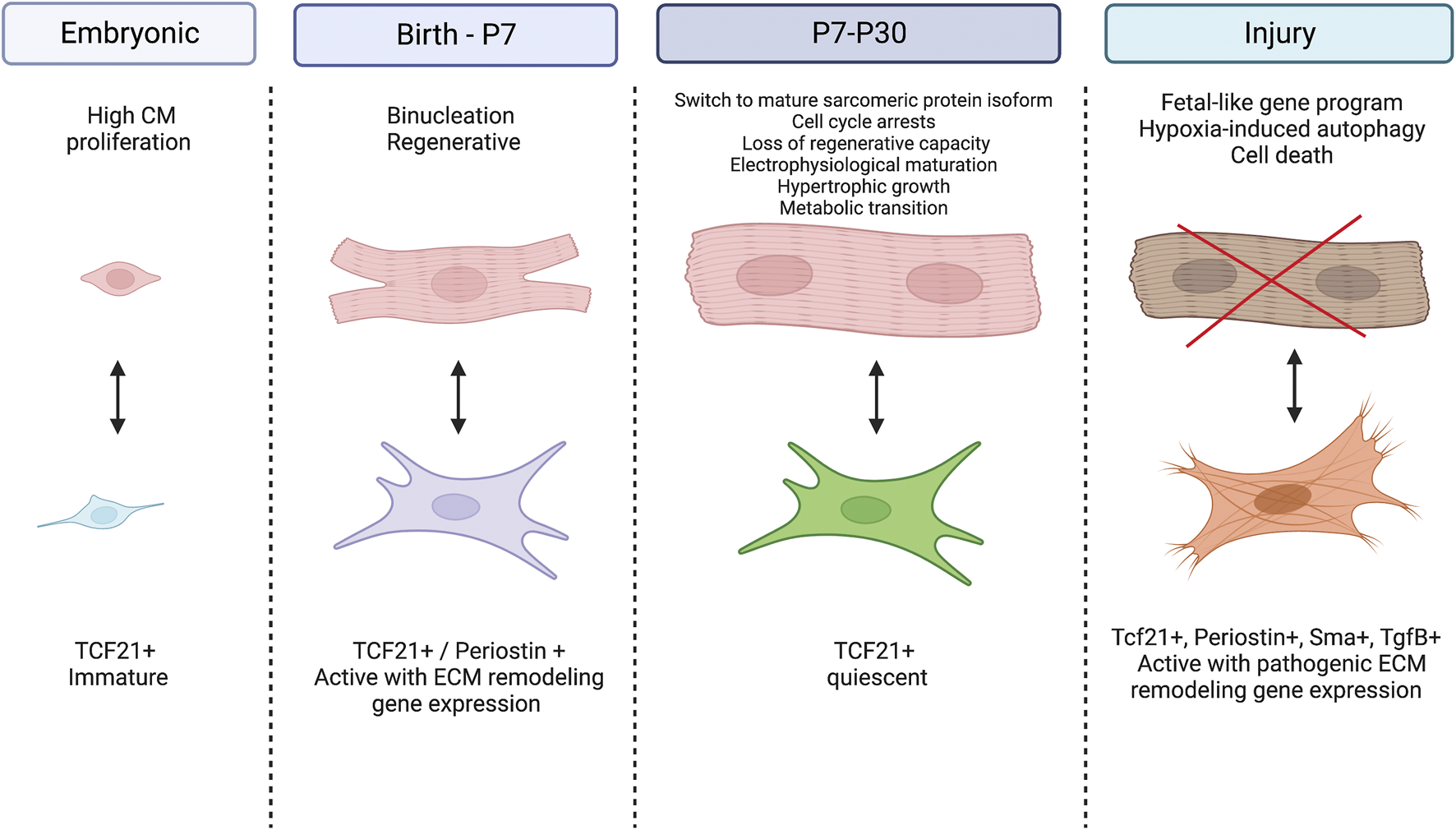 Cardiomyocyte-Fibroblast cellular crosstalk in the developing and diseased heart. During the embryonic period, cardiac fibroblasts remain immature while cardiomyocytes experience high rates of proliferation. At birth, fibroblasts become activated and signal for cardiomyocytes to exit the cell cycle, switch to hypertrophic growth and undergo metabolic transition. Between P7 and P30, fibroblasts return to their quiescent state while cardiomyocytes further their maturity by switching their expression to adult sarcomeric proteins and mature electrophysiology. After injury, fibroblasts become activated and secrete pathogenic ECM proteins while cardiomyocytes experience hypoxia induced autophagy and eventually cell death. Created with BioRender.com.
