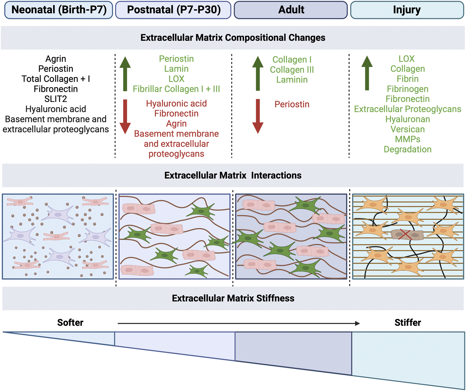 Extracellular matrix mechanical effects on cardiomyocytes and fibroblasts in development and disease. The extracellular matrix (ECM) plays a role in the maturation of cardiomyocytes and function of fibroblasts. After birth, the ECM undergoes mechanical changes, specifically the increased stiffness of the matrix due to changes in the ECM protein composition, secreted by fibroblasts. ECM stiffness increases from neonatal to adulthood, with the highest stiffness occurring during disease, which results in fibrosis and scarring. The compositional changes that occur at each stage are listed, with green as increase and red as decrease in ECM proteins. Created with BioRender.com.