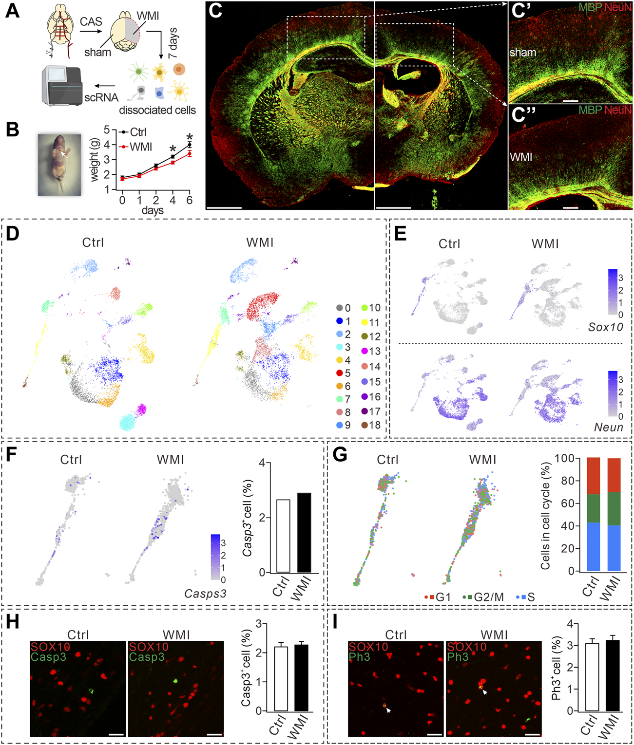 FIGURE 1. CAS-induced WMI and scRNA-Seq analysis. (A) Schematic diagram of scRNA-Seq of sham and WMI cortex. P3 mice were euthanized on day 7 after unilateral CAS. Sham and WMI hemispheres were dissected and dissociated into a single-cell suspension. Single cells and barcoded beads were captured into droplets for RNA-Seq. (B) Left: image of a mouse after the surgery and wound ligation (arrowhead); Right: body weight after CAS surgery in control (Ctrl) and WMI mice. Day 4: 3.2 ± 0.1 g (Ctrl; n = 9) and 2.8 ± 0.1 g (WMI; n = 9), p = 0.030. Day 6: 4.0 ± 0.2 g (Ctrl; n = 9) and 3.4 ± 0.2 g (WMI; n = 9), p = 0.044. (C) Coronal view of a mouse brain (P10) subjected to unilateral CAS with MBP and NeuN staining. The averages of MBP fluorescent intensity were 3,311 ± 507 (Ctrl; n = 4) and 1,167 ± 142 (WMI; n = 4), p = 0.015. (C’) and (C”) are magnifications of the boxed regions in (C). Scale bars: 1 mm (whole brain); 250 μm (magnifications). (D) UMAP graph showing unsupervised clustering of cells (P10 cerebral cortex). Distinct cell types are highlighted by different colors. (E) Gene expression profiles of Sox10 and Neun visualized via UMAP. The mRNA level is shown on a linear scale. Percentages of Sox10+ cells: 8.8% (control; n = 4) and 10.0% (WMI; n = 4). Percentages of Neun+ cells: 74.5% (control; n = 4) and 70.5% (WMI; n = 4). (F) Gene expression of caspase-3 (Casps-3) in an OL cluster. Percentages of caspase-3+ cells: 2.7% (control; n = 4) and 2.9% (WMI; n = 4). (G) Sox10-marked OLs partitioned into three clusters expressing the G1/S program, G2/M program, or non-cycling. In control: 43.0% (G1), 25.1% (G2/M), and 31.9% (S). In WMI: 40.5% (G1), 29.4% (G2/M), and 30.1% (S). (H) Expression of SOX10 and caspase-3 in P10 cerebral cortex: 2.2% ± 0.3% (control; n = 4) and 2.3% ± 0.8% (WMI; n = 4), p = 0.42. Scale bars: 50 μm. (I) Expression of SOX10 and PH3 in P10 cerebral cortex: 3.1% ± 0.3% (control; n = 4) and 3.2% ± 0.8% (WMI; n = 4), p = 0.67. Scale bars: 50 μm *p < 0.05.