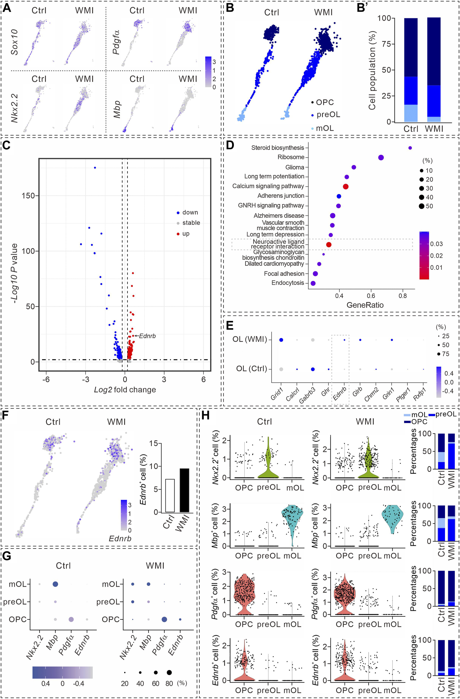 FIGURE 2. Transcriptional analysis during oligodendrocyte maturation. (A) UMAP plots showing the expression of Sox10, Nkx2.2, Pdgfα, and Mbp in OL clusters from P10 cerebral cortex. Averages in control: 57.4% (Nkx2.2), 57.1% (Pdgfα), and 13.5% (Mbp). Averages in WMI: 55.4% (Nkx2.2), 63.4% (Pdgfα), and 5.3% (Mbp). (B) Sox10+ cells partitioned into OPC, pre-OL, and mature OL (mOL) clusters. (B’) Averages in control: 56.4% (OPC), 27.1% (pre-OL), and 16.5% (mature OL). Averages in WMI: 64.8% (OPC), 30.4% (pre-OL), and 4.9% (mature OL). (C) Volcano plot derived from the single-cell transcriptomic analysis showing the differential gene expression pattern of OLs in control and WMI OLs. Y-axis: level of significance of each gene; X-axis: difference in the expression level of each gene. (D) Top 15 KEGG pathways revealed by GO analysis (dashed box: activated neuroactive ligand and receptor interaction pathways). (E) Dot plot showing differentially regulated genes in neuroactive ligand and receptor interaction pathways. Note the upregulation of Ednrb in the WMI group. Color scale: z-score; dot size: percentage. (F) UMAP plots show the expression of Ednrb in OL clusters from the control and WMI cerebral cortex (P10). (G) Marker gene expression across the three OL subpopulations. Dot size is proportional to the percentage of marker genes of each cluster, and blue color intensity is correlated with the expression level. (H) Violin plots of Ednrb, Nkx2.2, Pdgfα, and Mbp from the clusters defined in (G). Nkx2.2: For control, 52% (OPC), 20% (preOL) and 28% (mOL); For WMI, 24% (OPC), 72% (preOL) and 4% (mOL). Mbp: for control, 36% (OPC), 37% (preOL) and 28% (mOL); for WMI, 31% (OPC), 62% (preOL), and 7% (mOL). Pdgfα: for control, 93% (OPC), 3% (preOL), and 4% (mOL); for WMI, 87% (OPC), 12% (preOL), and 1% (mOL). Ednrb: for control, 87% (OPC), 7% (preOL), and 6% (mOL); for WMI, 76% (OPC), 20% (preOL), and 4% (mOL).