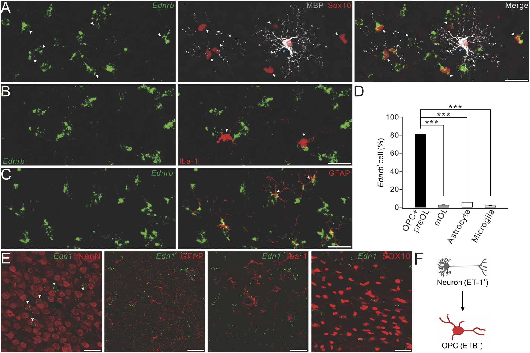 FIGURE 3. Expression of ETB and ET-1 in OPCs and neurons. (A) Representative control cerebral cortex section (P4) with Ednrb RNAScope probe and double-immunostaining of MBP and SOX10. White arrowheads, Ednrb+MBP−SOX10+ OPCs; and blue arrowheads, Ednrb−MBP+SOX10+ mature OLs (scale bar, 50 μm). (B) Ednrb RNAScope and immunostaining of Iba-1 in the control cerebral cortex (P4). Arrowheads, Ednrb−Iba-1+ microglia (scale bar, 50 μm). (C) Ednrb RNAScope and immunostaining of GFAP in control cerebral cortex (P4). Note that the arrowheads show Ednrb−GFAP+ astroglia (scale bar, 50 μm). (D) Percentages of Ednrb+ cells among OPCs and pre-OLs (80.8% ± 0.4%) and mature OLs (2.4% ± 0.3%; p < 0.001 vs. OPCs and pre-OLs), astrocytes (5.6% ± 0.3%; p < 0.001 vs. OPCs and pre-OLs), and microglia (1.6% ± 0.3%; p < 0.001 vs. OPCs and pre-OLs). (E) Representative Et-1 RNAScope and immunostaining of NeuN, GFAP, Iba-1, or SOX10 in the control cerebral cortex (P4). Arrowheads, Et-1+NeuN+ neurons (scale bars, 50 μm). (F) Schematic of the ET-1/ETB signaling module.