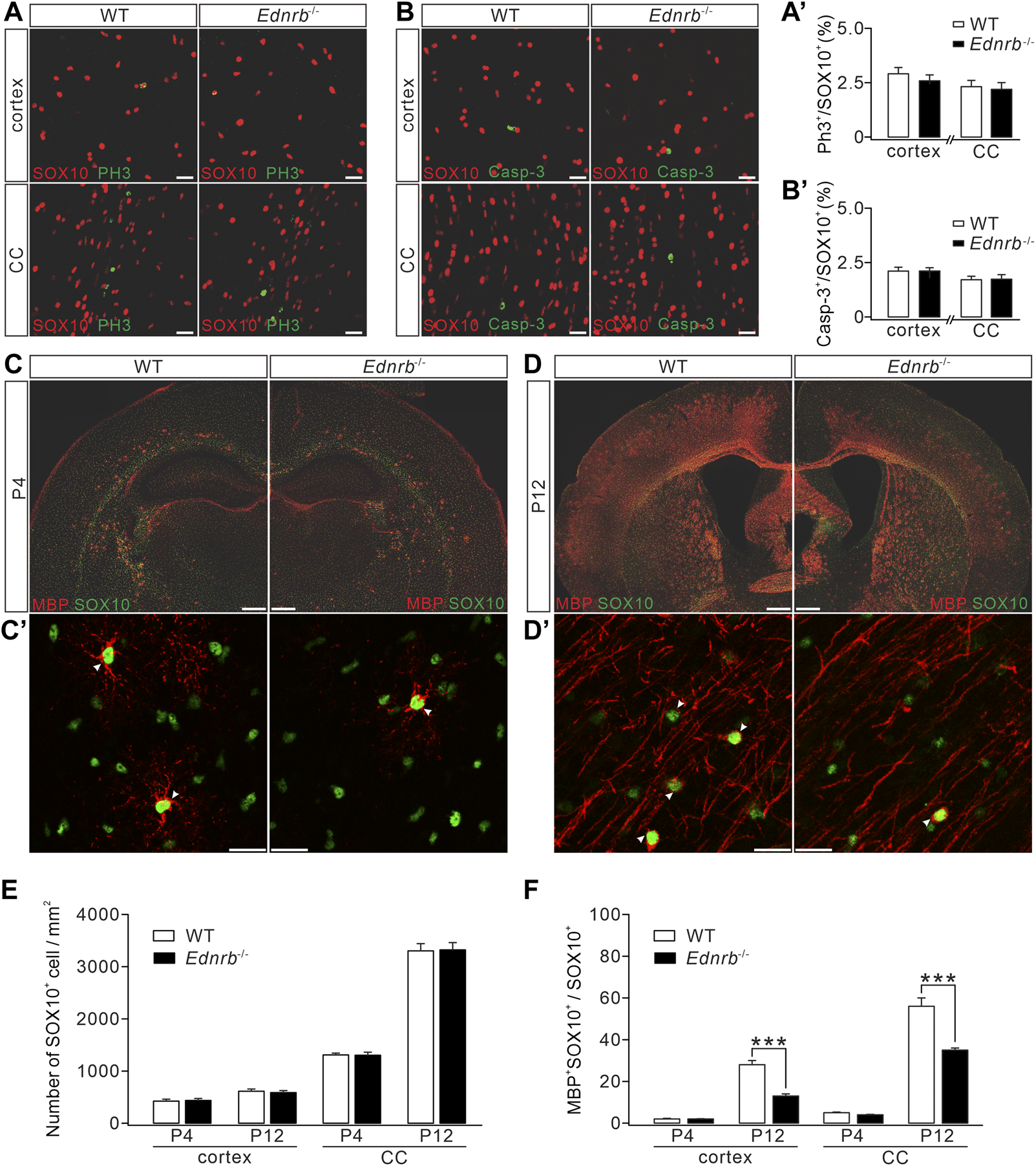 FIGURE 4. Effects of Ednrb ablation on MBP expression. (A) Double-immunostaining of SOX10 and PH3 in the cerebral cortex and corpus callosum (CC) of WT and Endrb−/− mice (P12). Scale bars: 50 μm. (A′) Percentages of PH3+ cells among SOX10+ cells: 2.8% ± 0.2% (WT; n = 5) and 2.5% ± 0.4% (Endrb−/−; n = 5; p = 0.32) in the cortex; 2.3 %± 0.2% (WT; n = 5) and 2.1% ± 0.3% (Endrb−/−; n = 5; p = 0.87) in the corpus callosum. (B) Double-immunostaining of SOX10 and caspase-3 (Casp-3) in the cerebral cortex and corpus callosum of WT and Endrb−/− mice (P12). Scale bars: 50 μm. (B′) Percentages of caspase-3+ cells among SOX10+ cells: 2.1% ± 0.2% (WT; n = 3) and 2.1% ± 0.2% (Endrb−/−; n = 3; p = 0.93) in the cortex; 1.7% ± 0.2% (WT; n = 3) and 1.7% ± 0.2% (Endrb−/−; n = 3;p = 0.98) in the corpus callosum. (C) MBP and SOX10 in P4 mouse brain. Scale bars: 1 mm. (C′) Magnified view (cerebral cortex) showing the colocalization of SO X10 and MBP. Scale bars: 50 μm. (D) MBP and SOX10 in P12 mouse brain. Scale bars: 1 mm. (D′) Magnified view (cerebral cortex) showing the colocalization of SOX10 and MBP. Scale bars: 50 μm. (E) Density of SOX10+ cells. In the cortex: 419 ± 37/mm2 (WT + P4; n = 5) and 432 ± 37/mm2 (Endrb−/− + P4; n = 5; p = 0.79); 607 ± 42/mm2 (WT + P12; n = 5) and 581 ± 38/mm2 (Endrb−/− + P12; n = 5; p = 0.62). In the corpus callosum: 1,289 ± 34/mm2 (WT + P4; n = 5) and 1,290 ± 58/mm2 (Endrb−/− + P4; n = 5; p = 0.13); 3,271 ± 137/mm2 (WT + P12; n = 5) and 3,290 ± 138/mm2 (Endrb−/− + P12; n = 5; p = 0.74). (F) Percentages of MBP+SOX10+ cells in SOX10+ cells. In the cortex: 2% ± 0.4% (WT + P4; n = 5) and 2% ± 0.2% (Endrb−/− + P4; n = 5; p = 0.61); 28% ± 2% (WT + P12; n = 5) and 13% ± 1% (Endrb−/− + P12; n = 5; p < 0.001). In the corpus callosum: 5% ± 0.4% (WT + P4; n = 5) and 4% ± 0.4% (Endrb−/− + P4; n = 5; p = 0.06); 56% ± 4% (WT + P12; n = 5) and 35% ± 1% (Endrb−/− + P12; n = 5; p = 0.0005). ***p < 0.001.