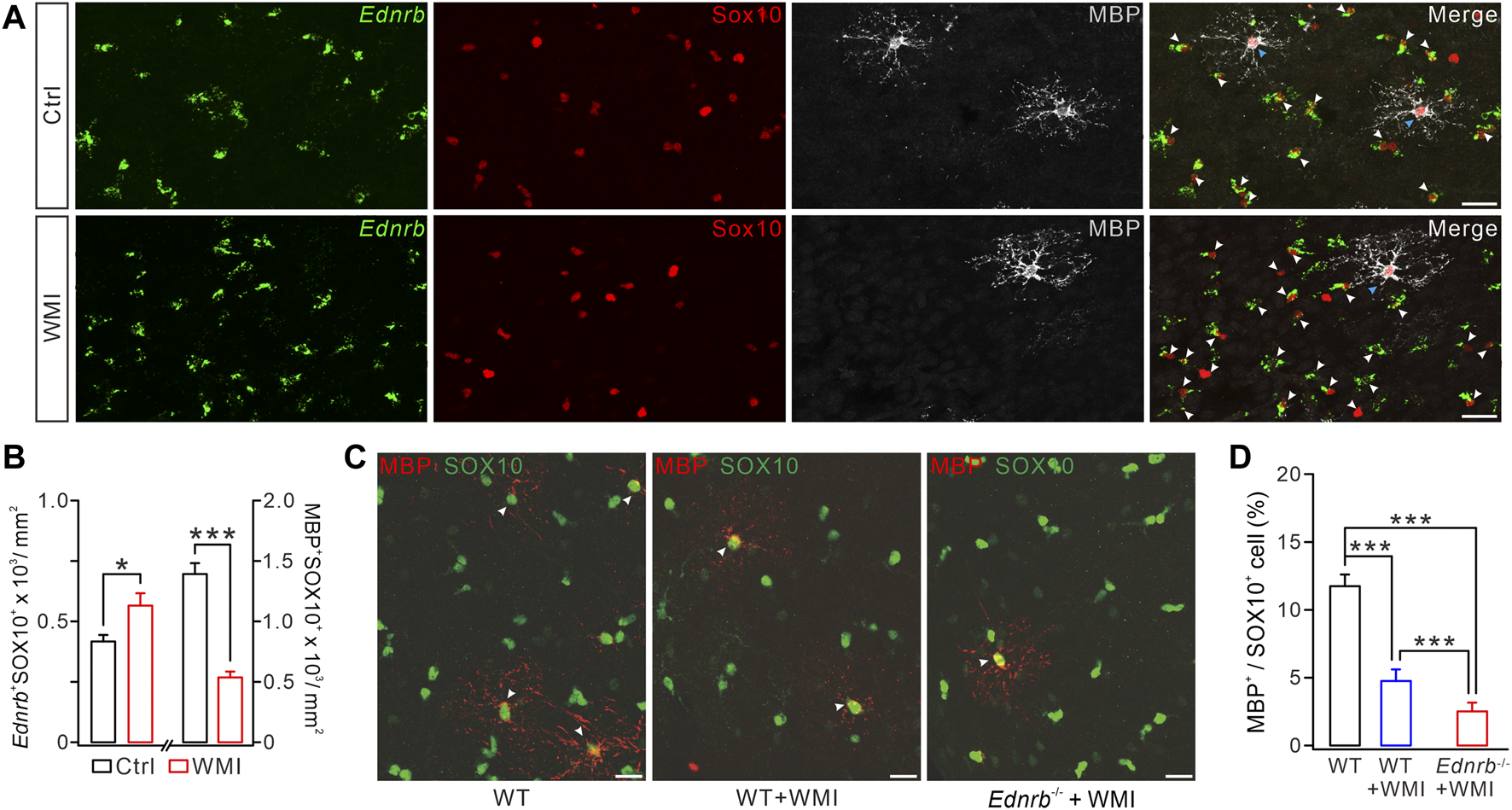 FIGURE 5. ETB deficiency exaggerates WMI-induced MBP reduction. (A) Ednrb RNAScope and immunostaining of MBP and SOX10 in control and WMI cerebral cortex (P10) (white arrowheads, Ednrb+ OPCs; blue arrowheads. Mature OLs; Scale bars, 50 μm). (B) Density of Ednrb+SOX10+ cells: 417 ± 27/mm2 (control; n = 4) and 566 ± 51/mm2 (WMI; n = 4; p = 0.023). Density of MBP+SOX10+ cells: 1,393 ± 90/mm2 (control; n = 4) and 537 ± 48/mm2 (WMI; n = 4; p < 0.001). (C) Double-immunostaining of MBP and SOX10 in WT, WT + WMI, and Endrb−/− + WMI cerebral cortex (P10) (white arrowheads. MBP+ mature OLs; scale bars, 50 μm). (D) Percentages of MBP+ cells among SOX10+ cells: 11.7% ± 0.8% (WT; n = 5), 4.8% ± 0.9% (WT + WMI; n = 5; p = 0.00019 vs. WT), and 2.6% ± 0.6% (Endrb−/− + WMI; n = 5; p < 0.001 vs. WT; p < 0.001 vs. WT + WMI). *p < 0.05. ***p < 0.001.