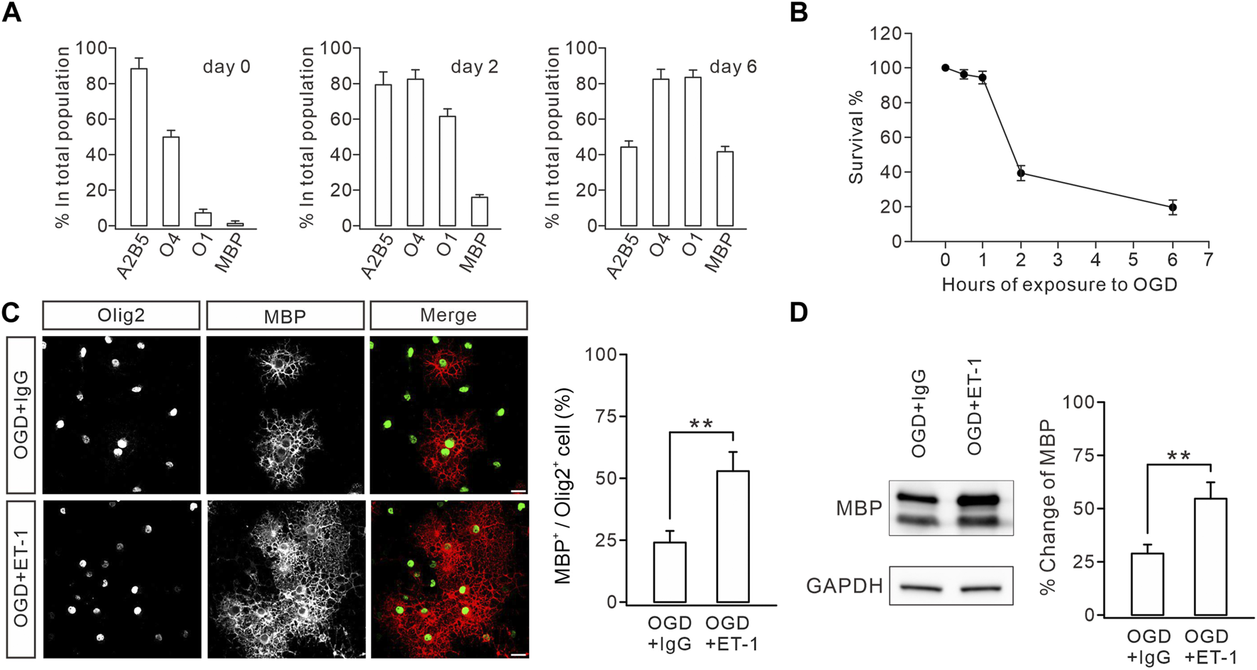 FIGURE 6. ET-1 ameliorates the OGD-induced defect in OL maturation. (A) Stage-specific cultures. Cultures were allowed to differentiate for 0, 2, or 6 days and stained for the OL stage-specific markers A2B5, O4, O1, and MBP. Bar graph shows the percentages of immunolabeled cells in the total population. For day 0: 88.2% ± 6.1% (A2B5), 49.8% ± 3.8% (O4), 7.0% ± 2.0% (O1), and 1.8% ± 0.8% (MBP); n = 5. For day 2: 79.2% ± 7.2% (A2B5), 82.4% ± 5.3% (O4), 61.4% ± 4.2% (O1), and 16.0% ± 1.5% (MBP); n = 5. For day 6: 44.2% ± 3.4% (A2B5), 82.4% ± 5.6% (O4), 83.4% ± 4.2% (O1), and 41.6% ± 3.0% (MBP); n = 5. (B) Effect of OGD duration on OPC death. Cultures were exposed to OGD for 0, 0.5, 1, 2, or 6 h, and cell survival was determined at 24 h. 0.5 h, 96.2% ± 2.7%, n = 5; 1 h, 94.6% ± 3.6%, n = 5; 2 h, 39.6% ± 4.3%, n = 5; 6 h, 19.8% ± 4.3%, n = 5. (C) After OGD, cultured OPCs were treated with IgG or ET-1, as well as T3, and immunostained with Olig2 and MBP antibodies (scale bars, 20 μm). The percentages of MBP+ cells in Olig2+ cells: 23.8% ± 4.2% (IgG; n = 5) and 52.8% ± 7.7% (Et-1; n = 5); p = 0.006. (D) Representative blots and percentage changes of MBP expression in cultured OLs with IgG or ET-1. MBP expression is normalized to the corresponding GAPDH. IgG, 28.8% ± 4.2% (n = 5); ET-1, 54.6% ± 7.6% (n = 5; p = 0.011). Gray dots indicate individual data points. **p < 0.01.
