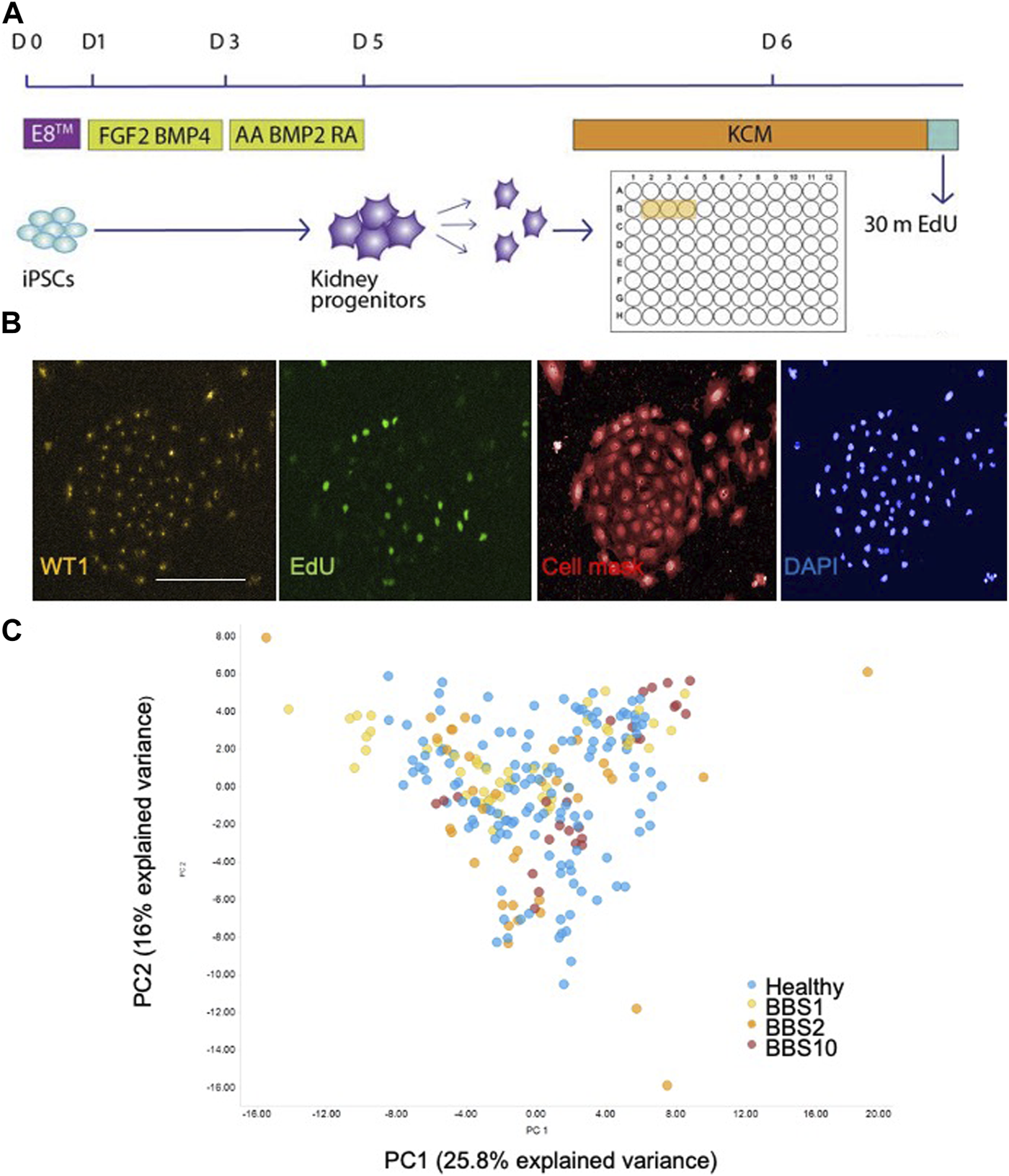 FIGURE 1. Single cell analysis of kidney progenitor cells. (A) Assay set-up. Following differentiation, cells were disaggregated and plated in triplicate wells. Cells are pulsed with EdU prior to fixation. (B) Examples of input images of control kidney progenitors for analysis. Scale bar, 300 μm. (C) 14 features were recorded per cell. Additional measurements were performed per well, giving a total of 85 data components. PCA was performed on the 85 features. The first two principal components (PC) are plotted, which together explain 41.8% of the variance. 28 donor lines were analysed, comprising 14 lines from healthy donors, 6 BBS1, 5 BBS2, 3 BBS10 lines. Data are from three biological replicates per line, each comprising 3 technical replicates (wells). Each data point in the plot corresponds to one well, in which 3,000 cells were plated.