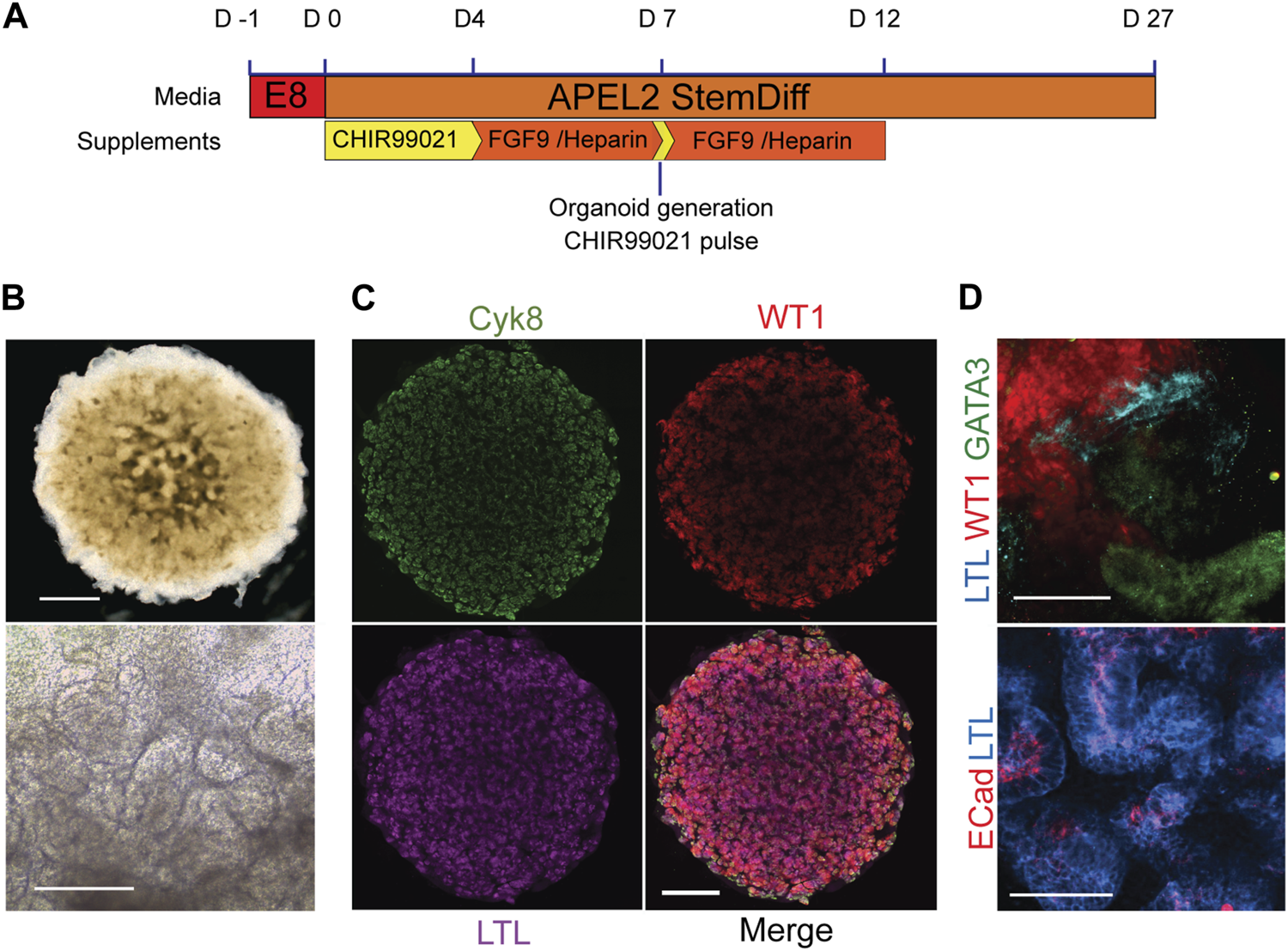 FIGURE 2. Kidney organoids from healthy donors. (A) Schematic of organoid differentiation protocol. (B) Representative bright field image of day 20 organoid from a healthy donor (Kegd_2). Top panel scale bar, 1 mm. Lower panel is a higher magnification showing internal architecture. Scale bar, 100 μm. (C) Immunofluorescence and lectin labelling of whole organoids for markers of collecting ducts (Cyk8), proximal tubules (LTL) and podocytes (WT1). Scale bar, 1 mm. (D) Higher magnification images show segmented nephron compartments: collecting duct (GATA3), podocytes (WT1) and proximal tubules (LTL and ECad). Scale bars, 100 μm.