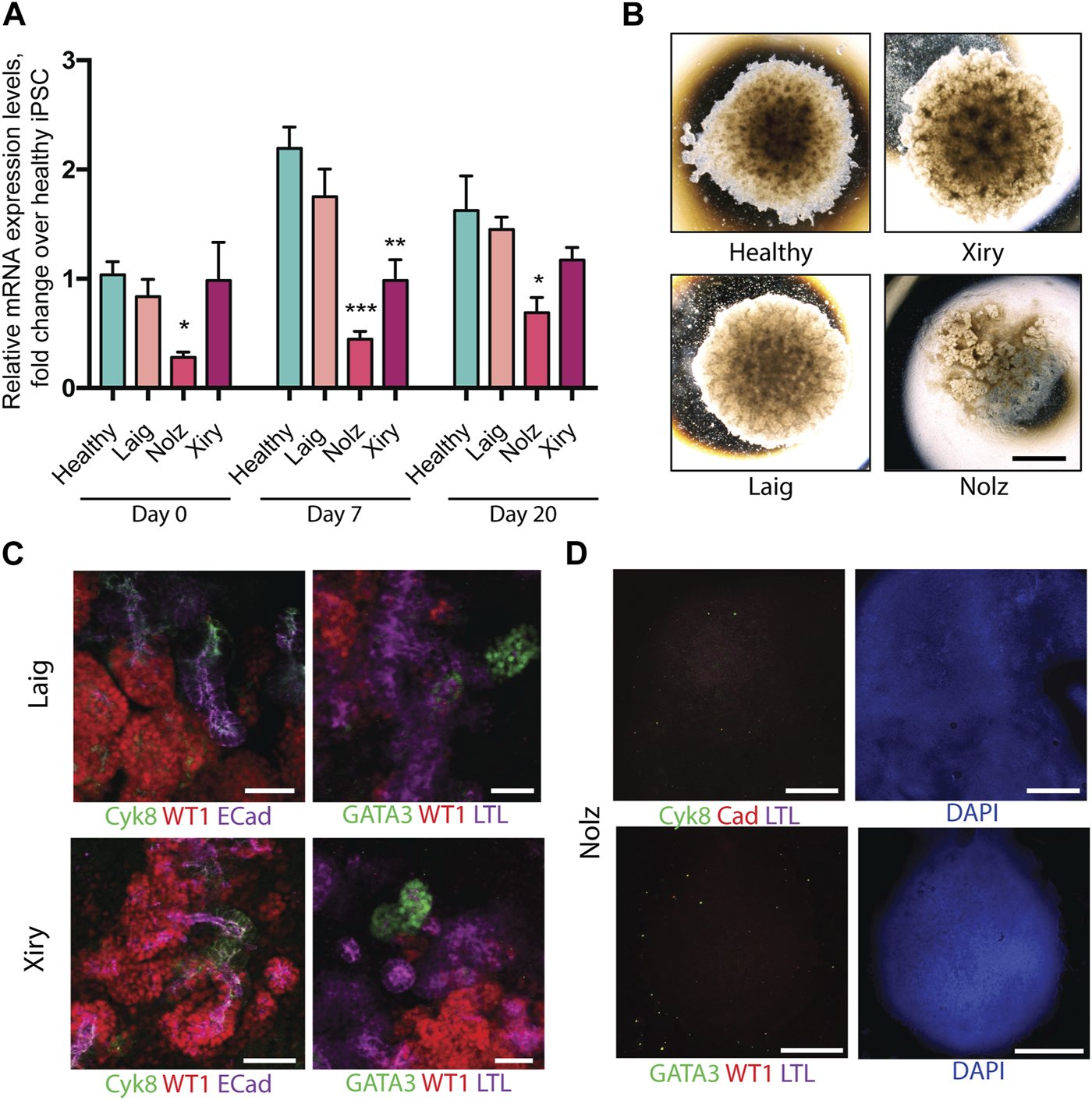 FIGURE 3. Kidney organoids generated by BBS10 mutant cell lines. (A) Q-PCR of BBS10 mRNA levels in healthy and mutant lines during differentiation. Healthy data were pooled from three donor lines (Cuhk_1, Hoik_1, Kegd_2) and day 0 contains an additional healthy donor line (Bima_2). For mutant lines n = 3–5 independent experiments for each condition and data from Laig and Xiry are pooled from both of their clones. Samples were normalized to GAPDH and 18 S. Primers attached to the 3′ end of the transcript and did not anneal directly over any mutation. Data show mean values ± SEM (one way ANOVA with Dunnet’s post hoc test). *p < 0.05, **p < 0.01, ***p < 0.001. (B) Bright field images of organoids on day 20. Note abnormal Nolz_4 organoid, with irregular structures, flattened regions and lack of rounded, domed architecture. (C) Immunofluorescence labelling of segmented nephron structures in Laig and Xiry organoids on day 20 of culture. (D) Immunofluorescence labelling of Nolz_4 organoids on day 20 showing lack of expression of nephron markers. Scale bars: (B) 1.5 mm, (C) 50 μm, (D) 1 mm.