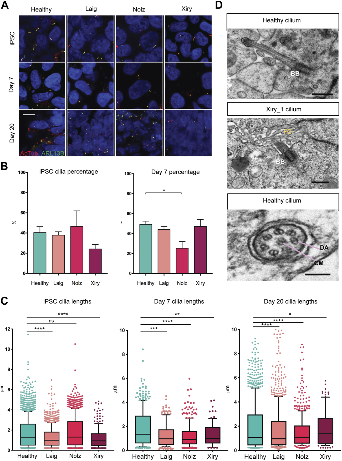 FIGURE 4. BBS10 mutations impact cilia length and quantity. (A) Immunofluorescence images of primary cilia labelled with antibodies to acetylated tubulin (AcTub) and ARL13B. Undifferentiated (iPSC) and day 7 differentiated cells were grown on glass coverslips. Day 20 images are 18 μm cryosections of organoids. Scale bar, 10 μm. (B) Percentage of undifferentiated and day 7 differentiated cells possessing a cilium. 200–1,500 cells were scored per condition over a minimum of three independent experiments. Healthy data are combined from three lines (Kegd_2, Kute_4 and Hoik_1). Data show the mean values ± SEM (one-way ANOVA with Dunnett’s post hoc test). (C) Box and whisker plots of ciliary lengths in undifferentiated iPSCs and day 7 and day 20 differentiated cells. Each point represents one cilium. Data were pooled from 3–5 independent experiments per line. N = approximately 100 data points (Xiry), > 500 (Healthy, Laig, Nolz). Black horizontal bars show median values. A Kolmoglorov-Smirnov test was used to compare distributions between lines from healthy (Kegd_2, Kute_4 and Hoik_1) and BBS10 donors. *p < 0.05, **p < 0.01, ***p < 0.001, ****p < 0.0001, ns: not significant. (D) Transmission electron micrographs of cilia in day 20 organoids. Xiry_1 BBS10 mutant line showed normal organization of the basal body (BB) and axoneme projecting into luminal, microvilli (MV) filled space. Bottom image, cilium characterized by a central microtubule (CM) pair, and dynein arms (DA), from a healthy organoid (Kegd_2). Scale bars, 500 nm (upper two images), 100 nm (bottom image).