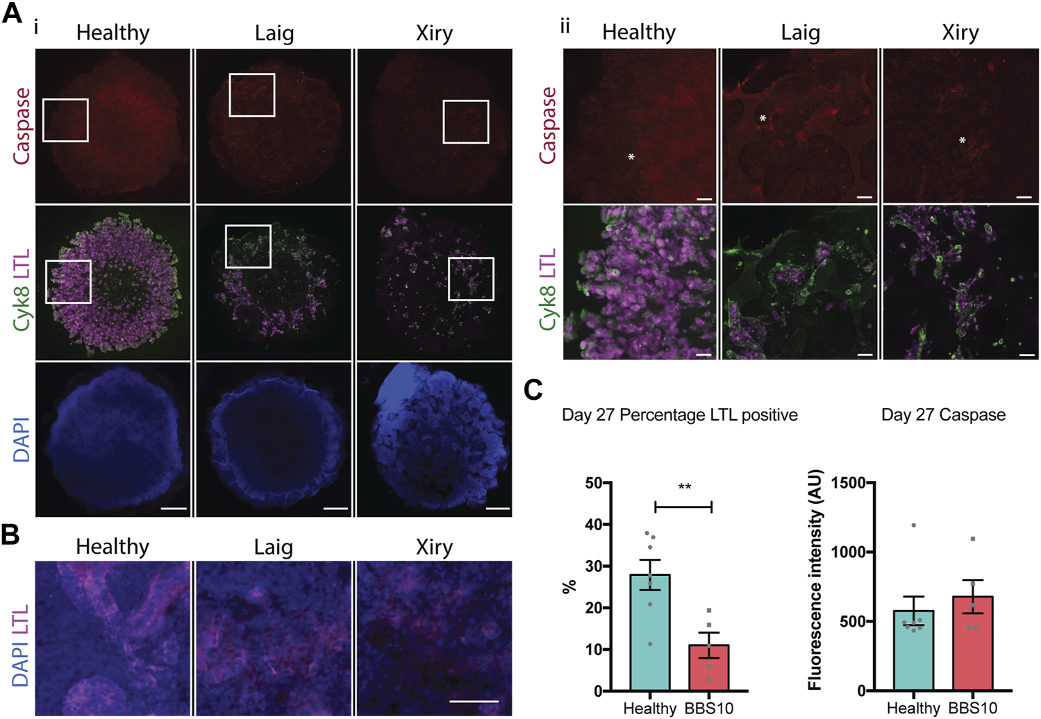 FIGURE 5. Loss of proximal tubular compartment in BBS10 mutant kidney organoids. (A) Immunofluorescence labelling of day 27 whole organoids. Note reduction in LTL staining of Laig and Xiry lines compared with healthy donor line. Note low intensity of cleaved Caspase-3 in all organoids. Left hand panels (i) show intact organoids. Boxed areas are shown at higher magnification in right hand panels (ii). Asterisks show individual positive cells. (B) Higher magnification view of day 27 organoids showing intact tubules in LTL positive regions of healthy organoid, but degeneration in Laig and Xiry organoids. (C) Quantification of LTL positive regions and cleaved caspase 3 labelling in whole organoids. % LTL was determined using DAPI to calculate whole organoid volume from multiple Z-plane stacked images. Mean cleaved Caspase-3 intensity per organoid is shown. Each point represents one organoid; each organoid came from an independent experiment. “Healthy” comprises 5 independent differentiations of two donor lines (Hoik_1 and Kegd_2). “BBS10” comprises 5 independent differentiations (Laig x 3 and Xiry x 2). Bars show mean ± SEM with an unpaired Student’s t test. **p = <0.01.