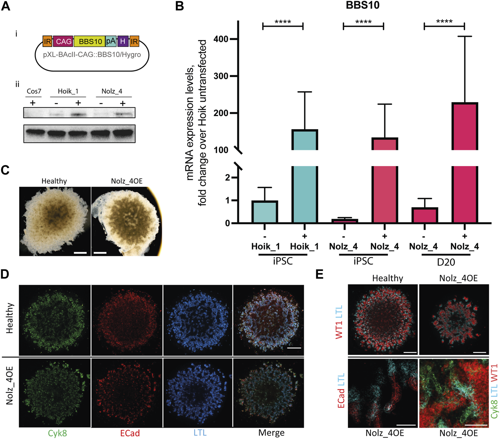 FIGURE 6. Effects of wild type BBS10 overexpression. (Ai) BBS10 plasmid containing the wildtype human BBS10 gene with a poly Adenylation (pA) tail and Hygromycin (H) resistance gene under the control of a CAGGS promoter. The construct was flanked by inverted repeats (IR) in the pXL-BAcII backbone. (B) Q-PCR of BBS10 mRNA levels without (−) and with (+) the wild type transfected construct in a healthy line (Hoik_1) and patient line (Nolz_4) in pluripotent cells (iPSC) and after differentiation of Nolz_4 at day 20. Three independent experiments for each condition. Samples were normalized to GAPDH and 18 S mRNA. BBS10 primers attached to the 3′ end of the transcript away from the mutated site. Data show mean values ± SEM (F-test). ****p < 0.0001. (Aii) Western blot of untransfected (−) and transfected (+) iPSCs showing upregulation of a band at ∼81 KDa corresponding to BBS10. The monkey fibroblast-like cell line Cos7 was used as a negative control as the BBS10 antibody does not cross-react with monkey proteins. (C) Bright field images of day 20 organoids in the healthy Hoik_1 and Nolz_4 over expressing BBS10 (Nolz_4OE). Scale bar, 1 mm. (D,E) Day 20 organoids from the healthy line Hoik_1, and patient line overexpressing wildtype BBS10 (Nolz_4OE) showing labelling for Cyk8, ECad, LTL and WT1. (E) Higher magnification of Nolz_4OE in lower panels show presence of markers of nephron structures: proximal tubules (LTL, ECAD) collecting ducts (Cyk8), podocytes (WT1). Scale bars: 1 mm (D,E), 100 μm (E).