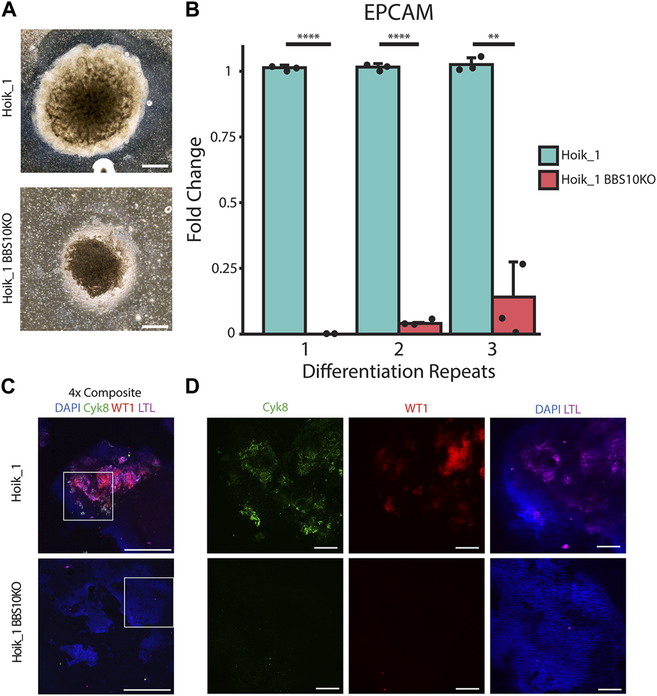 Three independent rounds of differentiation were performed simultaneously on Hoik_1 and the BBS10KO line. At least three organoids per line per differentiation protocol were examined. After differentiation the morphology of the BBS10KO line was very similar to that seen in Nolz_4, a small organoid which had failed to expand properly, whereas the regular Hoik_1 line was able to grow and differentiate successfully into a large organoid with morphologically visible tubules (Figure 7A). qPCR analysis showed reduced expression of the epithelial marker gene EPCAM in BBS10KO cells (Figure 7B). Cyk8, WT1 and LTL labelling revealed positive cells in all healthy Hoik_1 organoids, whereas marker expression in the BBS10KO line was not detected (Figure 7C). These observations support an association between BBS10 truncation and a failure of renal epithelial differentiation within kidney organoids.