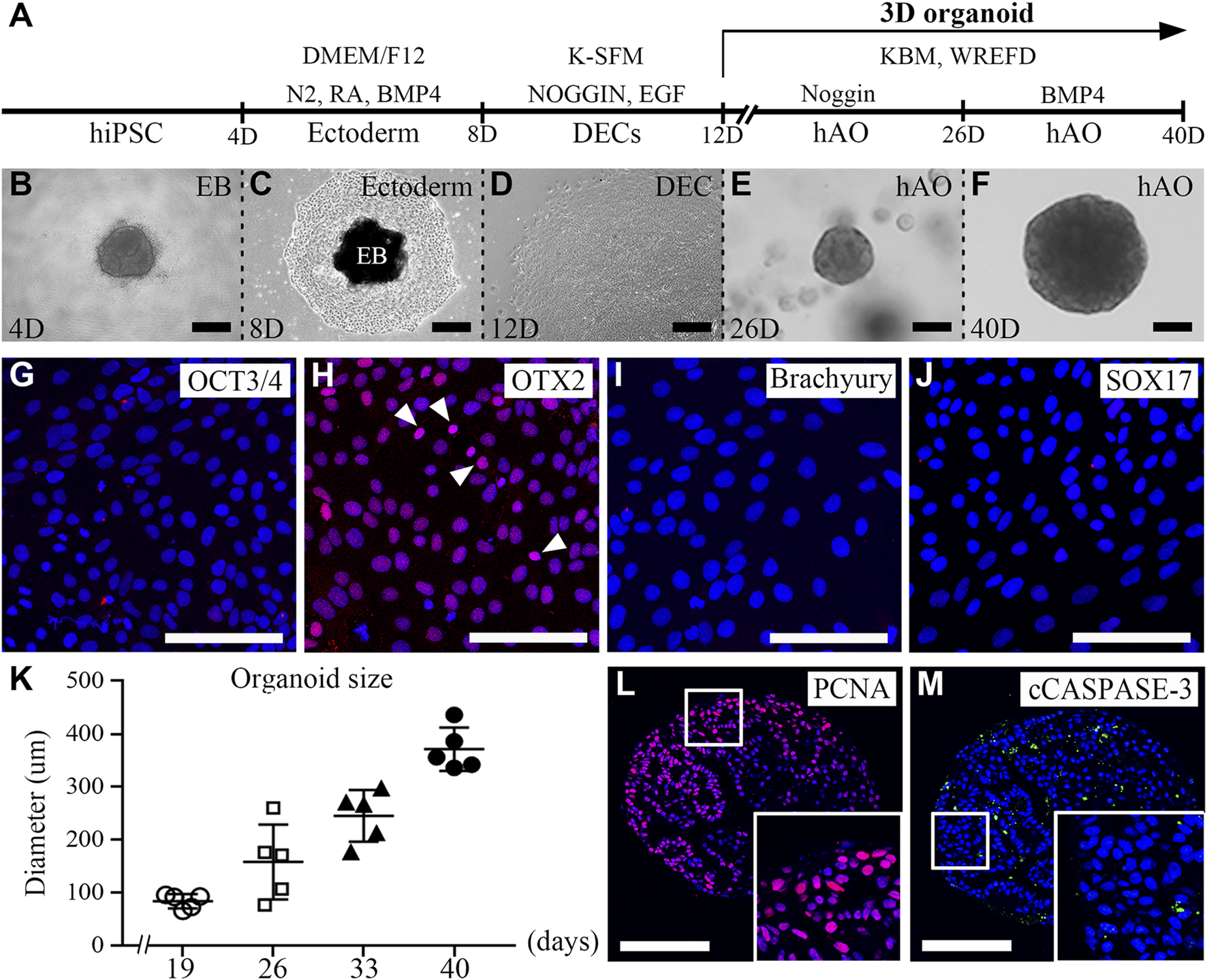 Generation of hiPSC-derived ameloblast organoids. (A) Schematic overview of the procedures for generating hiPSC-derived organoids. (B) Between days 0 and 4, hiPSCs were cultured in StemFlex medium using a U-bottom plate to form EBs. (C) Between days 4 and 8, EBs were cultured in a fibronectin-coated dish with DMEM/F12 medium supplemented with N2, RA, and BMP4. (D) Between days 8 and 12, the medium was replaced with K-SFM, Noggin, and EGF. (E) Between days 12 and 26, the dissociated cells were embedded into Matrigel and cultured in KBM including Wnt3a, R-spondin1, EGF, FGF10, dibenzazepine, Noggin, nicotinamide, A83-01, N-acetylcysteine, and Y-27632 (WREFD with Noggin). (F) Between days 26 and 40, the medium was replaced by removing Noggin and adding BMP4 (WREFD with BMP4). (B–F) Representative bright field images of cells at each time period. (G–J) Immunocytochemistry of OCT3/4, OTX2, Brachyury, and SOX17 in ectodermal cells cultured for 8 days. Only OTX2 was expressed in ectodermal cells. (K) The diameter of organoids was plotted (n = 5), and hiPSC-derived organoids gradually increased in size to approximately 400 μm. (L, M) Immunohistochemistry of PCNA and cCaspase-3 in organoids. PCNA was expressed in most organoid cells. In contrast, cCaspase-3 was rarely expressed in organoids. Scale bars: E, F, G, H, I, L, and M = 100 μm, B and D = 200 μm. TOPRO-3 (blue) was used to label the nuclei. White arrow heads: expression cells.