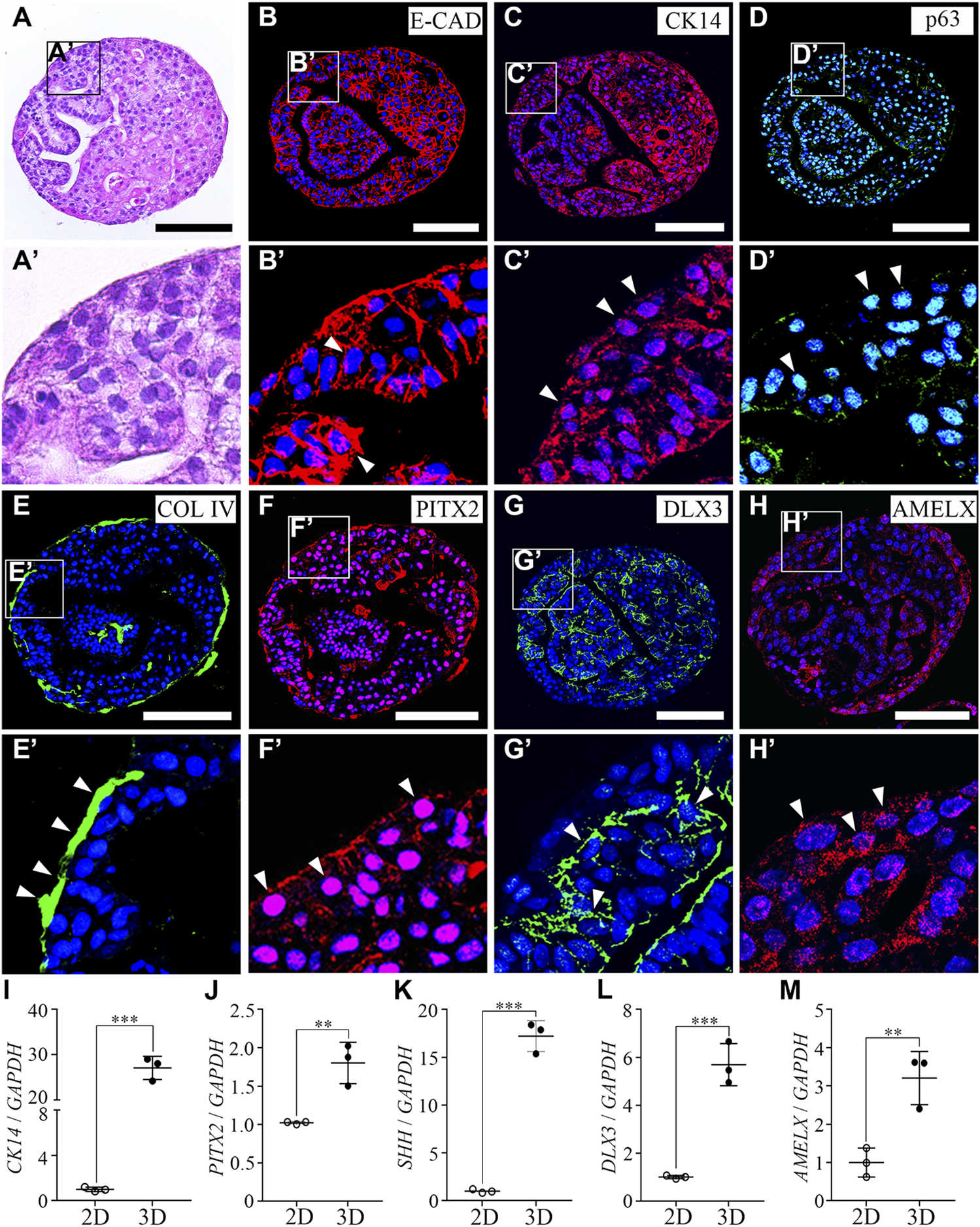Characterization of hiPSC-derived ameloblast organoids. (A) H&E staining of paraffin sections of hiPSC-derived organoids. The round organoids displayed dense and complex morphologies. Organoids consisted of one cell layer in the outermost layer, a dense inner structure, and budding structures that are irregularly entangled inward. (B, C) Immunostaining of epithelial cell markers, E-CAD and CK14, (D) a basal epithelial cell marker, p63, (E) a basement membrane marker, Col IV, (F) a dental epithelial cell marker, PITX2, and (G, H) ameloblast markers, DLX3 and AMELX in organoids. (B′–H′) Higher magnification of the regions of interest shown in (B–H). (I–M) mRNA expression of CK14, PITX2, SHH, DLX3, and AMELX was analyzed by RT-qPCR. On comparing the 2D (hiPSC-derived dental epithelial cells) and 3D cultures (hiPSC-derived organoids), the RNA expression levels of epithelial cell markers, dental epithelial cell markers, and ameloblast markers were significantly increased in the 3D culture. All experiments were performed in triplicate. Data are presented as means ± standard deviations (SD). TOPRO-3 (blue) was used to label the nuclei. Scale bar = 100 μm. White arrow heads: expression cells.