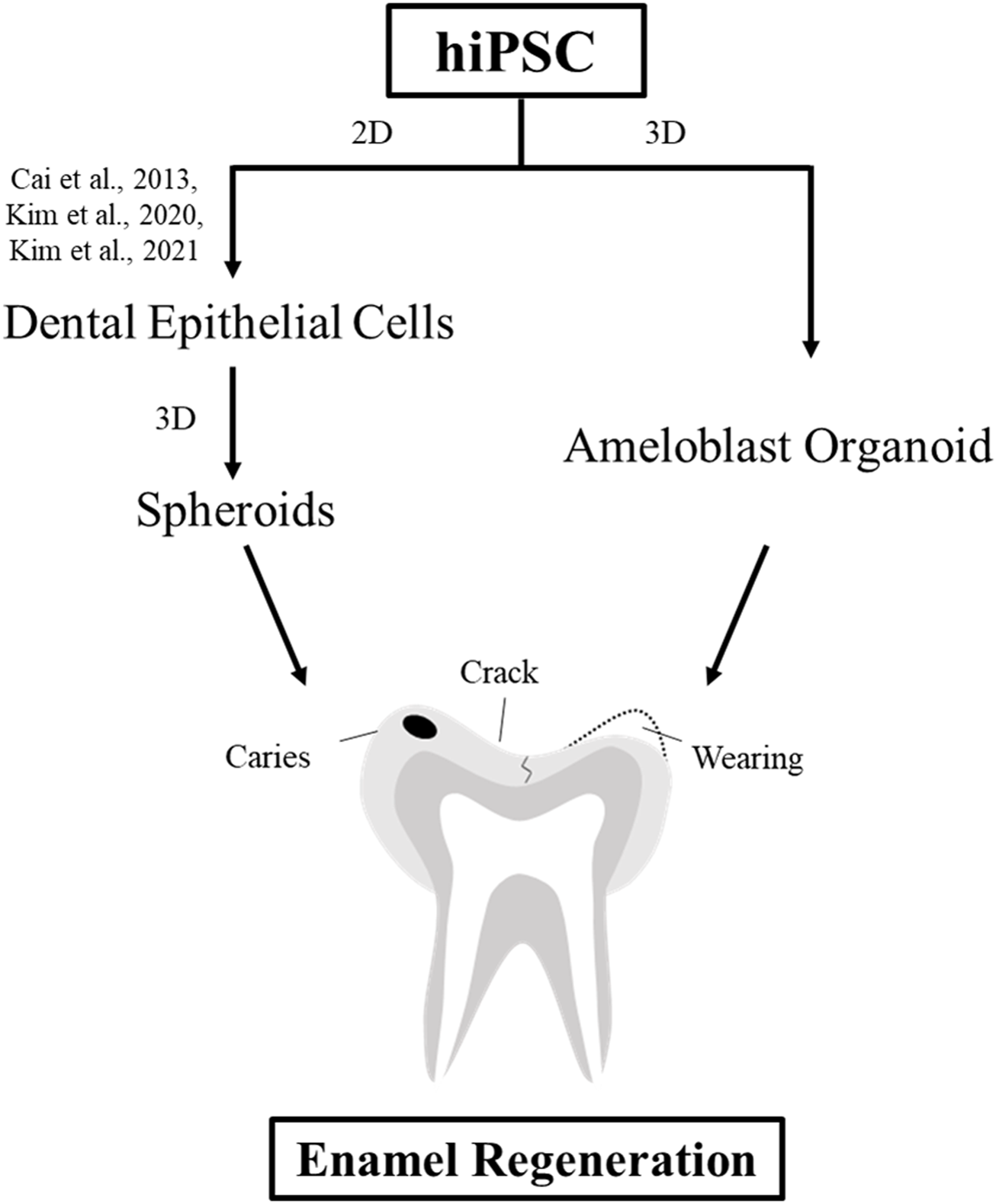 Schematic diagram of the strategies for enamel regeneration. Suitable sources of dental epithelial cells for enamel regeneration to repair enamel damage are expanded in the culture to generate a sufficient number of cells using either 2D or 3D culture systems. Dental epithelial cells were differentiated upon modulation of the signaling pathway in the 2D monolayer culture system. Dental epithelial cells derived from hiPSCs were cultured in a suspension to form spheroids. In this study, ameloblast organoid derived from hiPSCs (hAO) were differentiated upon Noggin–BMP modulation using the 3D culture system after 40 days and recombined with the mouse dental mesenchyme.