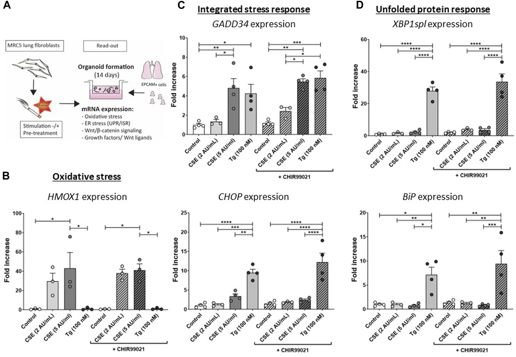 CSE induces stress responses in MRC-5 lung fibroblasts MRC-5 fibroblasts were cultured until confluency was reached, after which they were serum-starved for 24 h. Upon starvation, MRC-5 fibroblasts were exposed to vehicle (white dots/bars) freshly-prepared CSE (2 or 5 AU/mL, light and dark grey dots/bars resp.) for 15 min or Tg (dark grey dots/grey bars) and stimulated for 6 h. CHIR99021 or vehicle (2 μM, stripes bars) was added during stimulation with CSE or Tg (experimental set-up shown in (A)). Cells were then lysed for RNA isolation, cDNA synthesis and RT-qPCR. HMOX1 expression (B) was measured as marker for oxidative stress. GADD34 (C) and CHOP mRNA expression were determined as a read-out for activation of the ISR, whereas XBP1spl and BiP (D) were measured to determine UPR activation. Data are shown as mean ± SEM (with individual datapoints); N = 3–4 independent experiments; *p < 0.05, **p < 0.01, ***p < 0.001, ****p < 0.0001 Data were analyzed using One-way ANOVA statistical testing in Graphpad Prism 9.3.1. Abbreviations: AU/mL: arbitrary units/mL; CSE: cigarette smoke extract; ER stress: endoplasmic reticulum stress; ISR: integrated stress response; Tg: thapsigargin; UPR: unfolded protein response.