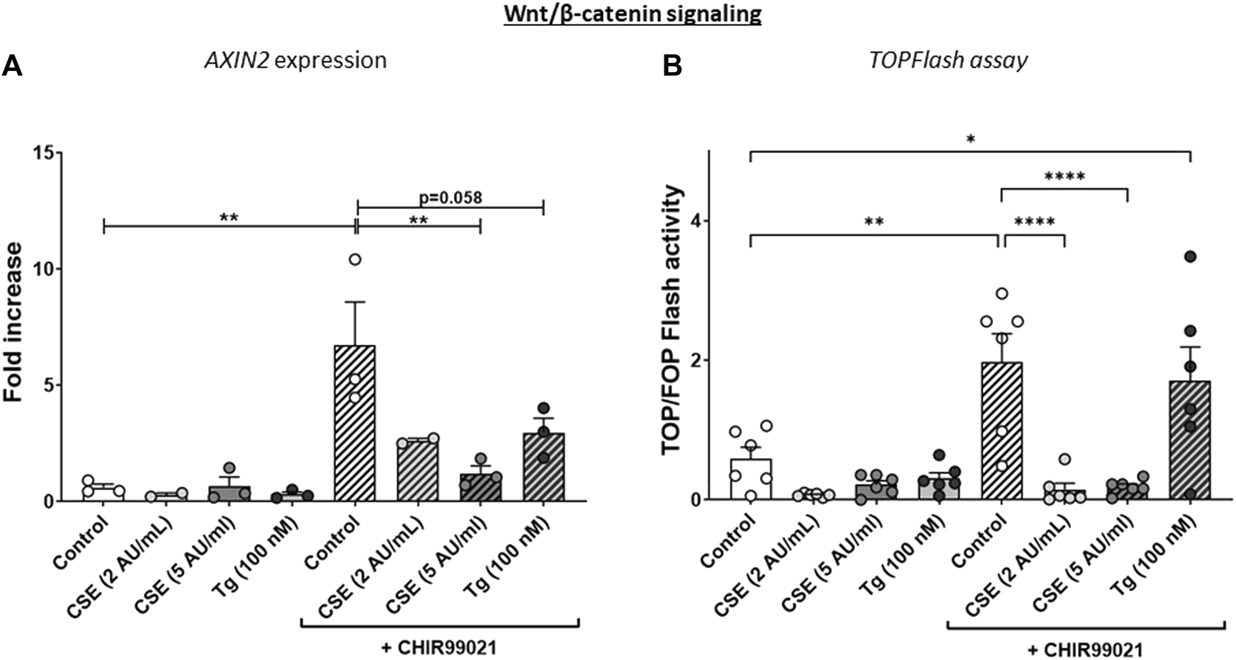 CSE lowers CHIR99021-induced Wnt/b-catenin signalling in MRC-5 lung fibroblasts. MRC-5 fibroblasts were cultured until confluency was reached, after which they were serum-starved for 24h. Upon starvation, MRC-5 fibroblasts were exposed to vehicle (white dots/bars) freshly-prepared CSE (2 or 5 AU/mL, light and dark grey dots/bars resp.) for 15 min or Tg (dark grey dots/grey bars) and stimulated for 6 h. CHIR99021 or vehicle (2 μM, stripes bars) was added during stimulation with CSE or Tg. Cells were then lysed for RNA isolation, cDNA synthesis and RT-qPCR. The effect on Wnt/β-catenin signalling was assessed by determining mRNA expression of AXIN2 (A) and using a TOP/FLASH reporter (B). Data are shown as mean ± SEM; N = 3-4 independent experiments; *p < 0.05, **p < 0.01, ***p < 0.001, ****p < 0.0001. Data were analyzed using One-way ANOVA statistical testing in Graphpad Prism 9.3.1. Abbreviations: AU/mL: arbitrary units/mL; CSE: cigarette smoke extract; Tg: thapsigargin.