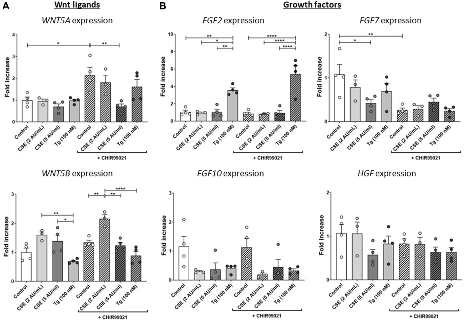 CSE impairs repair-related factors. MRC-5 fibroblasts were cultured until confluency was reached, after which they were serum-starved for 24 h. Upon starvation, MRC-5 fibroblasts were exposed to vehicle (white dots/bars) freshly-prepared CSE (2 or 5 AU/mL, light and dark grey dots/bars resp.) for 15 min or Tg (dark grey dots/grey bars) and stimulated for 6 h. Cells were then lysed for RNA isolation, cDNA synthesis and RT-qPCR. Expression of Wnt ligands (WNT5A and WNT5B) (A) and growth factors (FGF2, FGF7, FGF10 and HGF) (B) were determined as a read-out of repair-related factors. Data are shown as mean ± SEM; N = 3–4 independent experiments; *p < 0.05, **p < 0.01, ***p < 0.001, ****p < 0.0001. Data were analyzed using One-way ANOVA statistical testing in Graphpad Prism 9.3.1. Abbreviations: AU/mL: arbitrary units/mL; CSE: cigarette smoke extract; FGF: fibroblast growth factor; HFG: hepatocyte growth factor; Tg: thapsigargin.