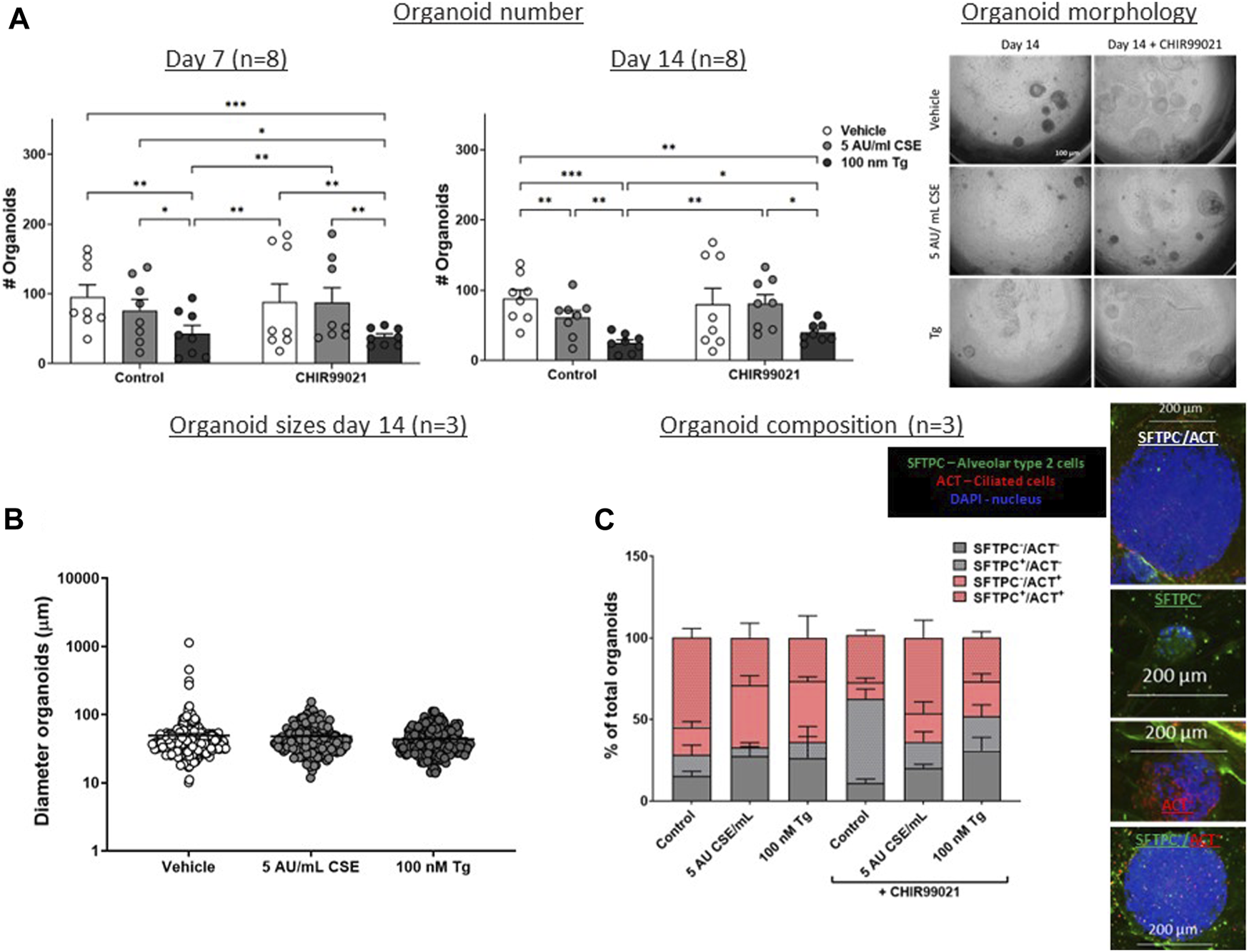 CSE and Tg pre-exposure of MRC-5 fibroblasts impairs mesenchymal support of epithelial organoid formation. MRC-5 fibroblasts were mitomycin-C inactivated for 2 h, followed by washing and a 1h recovery-period. Upon starvation, MRC-5 fibroblasts were exposed to vehicle (white dots/bars) freshly-prepared CSE (5 AU/mL, ldark grey dots/bars) for 15 min or Tg (dark grey dots/dark grey bars) and stimulated for 6 h. MRC-5 cells were then detached and seeded with freshly isolated mouse Epcam + lung epithelial cells in a 1:1 ratio in Matrigel, and organoid formation and growth was followed for 14 days. Organoid number (white arrows) was counted at day 7 and 14 (A). Data are shown as mean ± SEM; N = 4 independent MRC-5 fibroblast experiments, EPCAM+ cells: n = 8 mice; *p < 0.05, **p < 0.01, ***p < 0.001. Organoid size was determined at day 14 (B) in, and organoid composition was determined using immunofluorescence staining of organoids fixed at day 14 organoids. Organoids were costained for proSFTPC (alveolar, green) and ACT (bronchial, red) and displayed as percentage of total organoids expressing one, both, or neither markers (C) (for both n = 3 mice). The nuclei were visualized using DAPI (blue). Data presented in 4B were analyzed using One-way ANOVA statistical testing in Graphpad Prism 9.3.1. Data presented in Figures 4A,C were analyzed using Two-way ANOVA statistical testing in Graphpad Prism 9.3.1. Abbreviations: ACT: acetylated tubulin; AU/mL: arbitrary units/mL; CSE: cigarette smoke extract; SFTPC: pro-surfactant protein-C; Tg: thapsigargin.