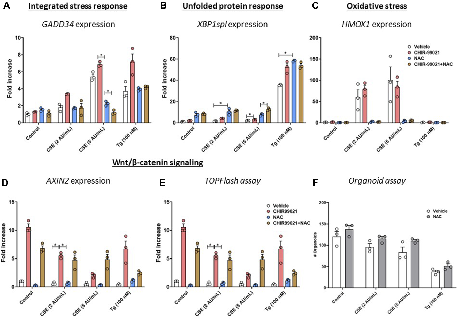 To determine the role of oxidative stress in the observed effects on Wnt/β-catenin signalling activation and support of organoid formation, MRC-5 fibroblasts were treated with CHIR99021 (2 µM) and/or N-acetylcysteine (NAC, 10 mM) or vehicle during the 6 h stimulation with CSE (2 or 5 AU/mL, 15 min exposure) or 100 nM Tg. There were no differences in expression of GADD34/PPP1R15A upon NAC or NAC + CHIR99021 pre-treatment (Figure 5A) compared to vehicle control. In contrast, XBP1spl was upregulated upon NAC pre-treatment of CSE-exposed cells (Figure 5B). Although non-significant, NAC pre-treatment reduced CSE-induced expression of HMOX1 (Figure 5C). mRNA expression of AXIN2 (Figure 5D) was unaltered upon NAC pre-treatment, which was confirmed using a Wnt/β-catenin reporter (Figure 5E). Despite our observation that NAC prevented CSE-induced effects on GADD34/PPP1R15A, and HMOX1, pre-treatment of MRC-5 cells with NAC did not affect epithelial organoid formation (Figure 5F). These findings suggest that the observed CSE-mediated inhibition of support of epithelial organoid formation (Figure 2A) only partly results from oxidative stress.