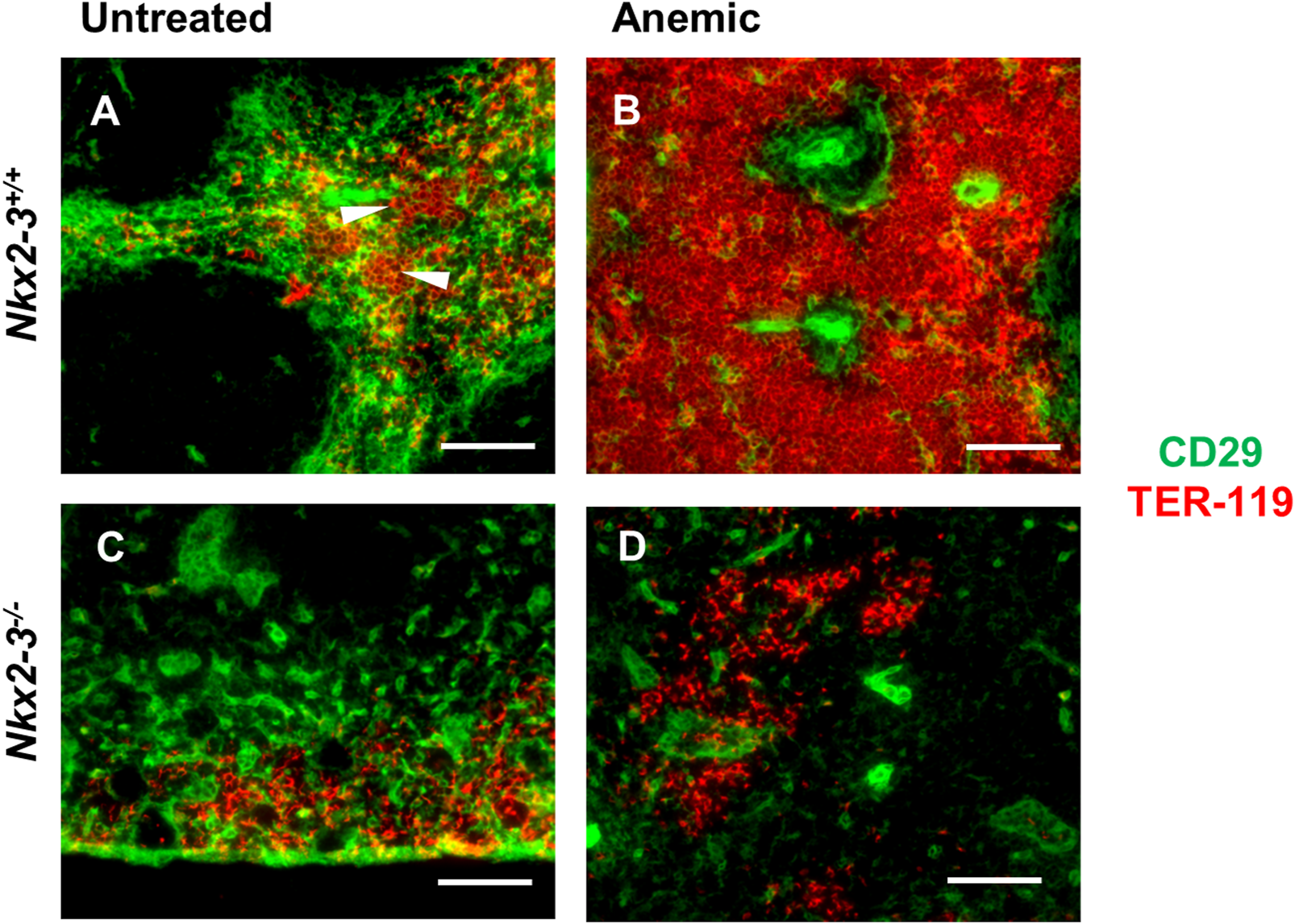 Defective extramedullary expansion of splenic erythroid colonies in mice lacking Nkx2-3 compared to wild-type mice. Compared to untreated controls (A), in anemic BALB/c mice the TER-119-positive erythroid colonies (red, arrowheads) embedded in CD29-positive stroma (green) expand throughout the RP following blood withdrawal (B); in Nkx2-3−/− mice (C–D) only erythrocyte clusters are visible, without any noticeable change upon blood loss. Representative dual fluorescence microscopic images from a cohort of n = 4. Scale bars correspond to 100 μm.