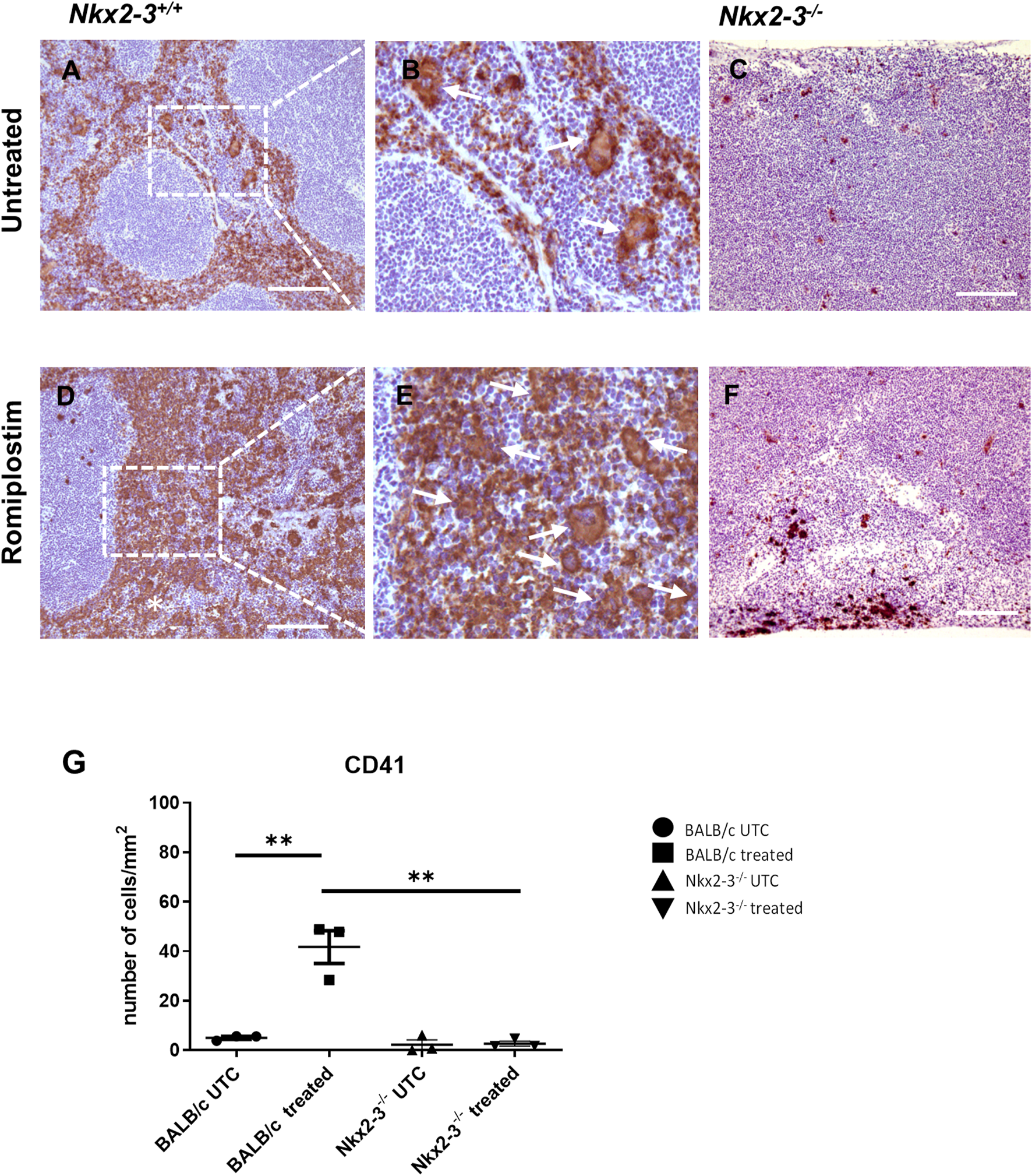 TPO-agonist treatment fails to induce splenic megakaryocyte expansion in mice lacking Nkx2-3. Representative images show megakaryocyte labeling of BALB/c or Nkx2-3−/− (indicated at the top) spleen using anti-CD41 immunohistochemistry (visualized as brown reaction product, with hematoxylin counterstain) before (untreated, (A–C) and after Romiplostim treatment (D–F), indicated on the left. Higher power inserts (B, E) corresponding to the dashed rectangle demonstrate single megakaryocytes restricted to the RP. In the samples after Romiplostim treatment the arrows in the high-power insert (corresponding to the rectangle) label multinucleated megakaryocytes typically arranged in pairs. Representative micrographs from a cohort of n = 4. Scale bars correspond to 100 μm. Graphs demonstrate the number of CD41+ cells per 1 mm2 in BALB/c (UTC n = 3, treated n = 3) and Nkx2-3−/− (UTC n = 3, treated n = 3) mice (G). **p < 0.01 by unpaired t-test and Mann Whitney U test (G).