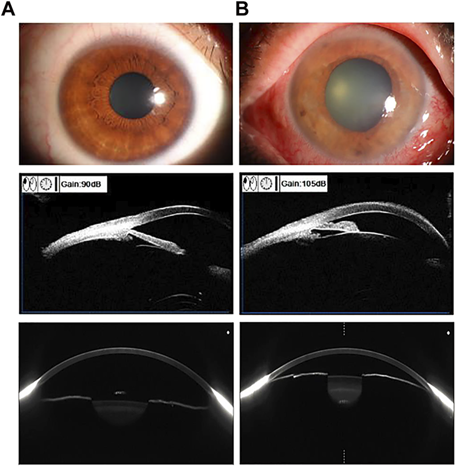 Using Anterior segment OCT (AS-OCT) in comparison with other imaging of the anterior segment of the eye. Examples of the preocular segment using ocular surface photography (first row), ultrasound biomicroscopy (second row), and AS-OCT scan (third row). Vertical column (A). Normal eye (B). Angle-closure eye.